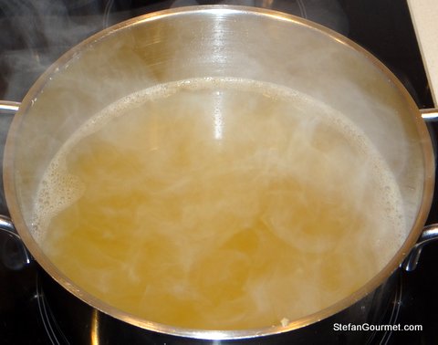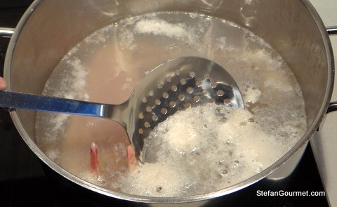 Bring to a boil and remove the scum that will rise to the surface with a slotted spoon.