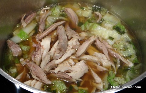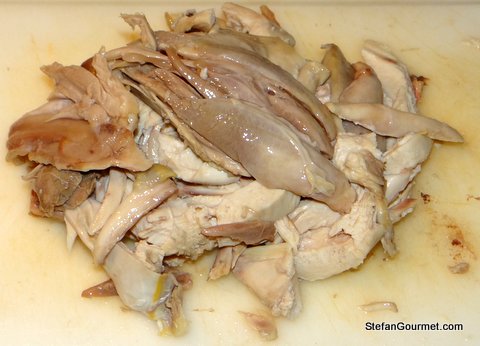 Take the chicken meat off the bones, shred the meat, and set aside. Return the bones to the broth.