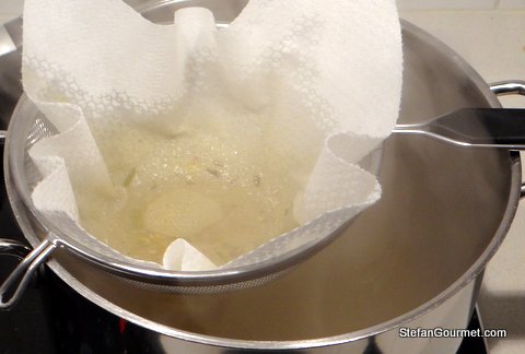 First filter the broth using a colander to get out the bones and vegetables, and then filter it again with kitchen paper or a cheese cloth.