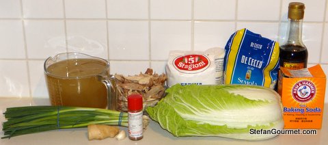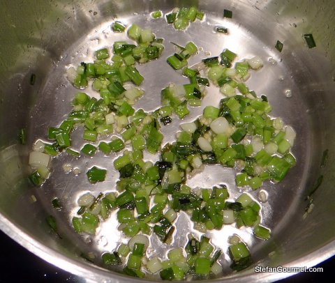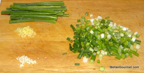 Chop the green onions, reserving the dark green part at the top. Also chop the garlic and the ginger.