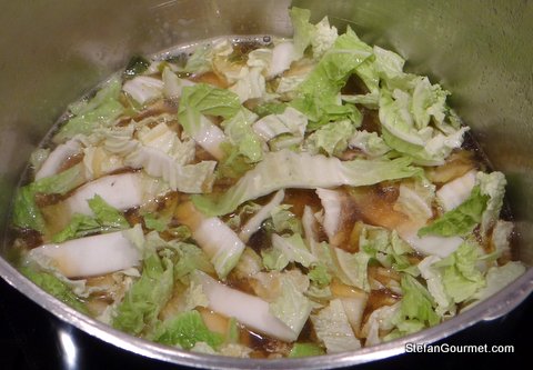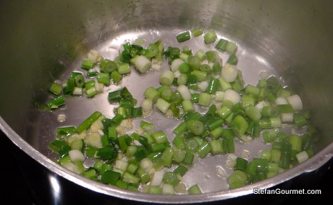 Heat some oil in a stock pot. Add the green onions, garlic, and ginger.