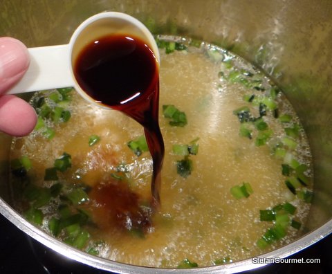 Add the chicken broth and bring it to a boil. Add the soy sauce.