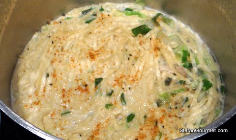 Add most of the reserved green onions, chopped, keeping some of the green onions for garnish.