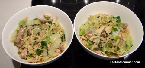 Divide the chicken, noodles, and cabbage among the serving bowls.