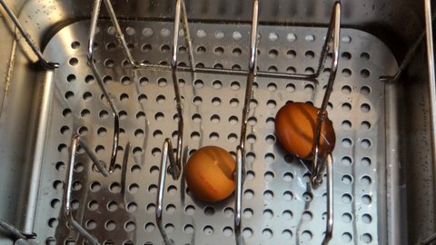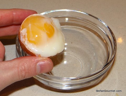 Cook the eggs sous-vide for 1 hour at 64C/147F. (Eggs are the only food that do not need to be vacuum sealed to be cooked sous-vide.)