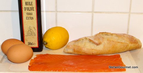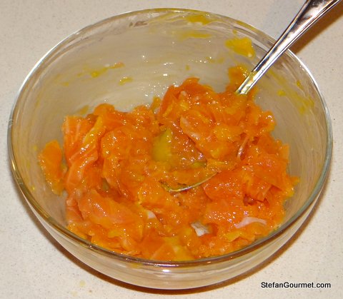 Add the salmon, cut into 1 cm (1/3″) strips, the lemon juice, and half of the lemon zest to the egg yolks. Stir to mix with a spoon. Taste and add more lemon juice if needed. You can also season with salt and freshly ground black pepper if you like, but I didn’t think that was necessary.