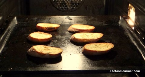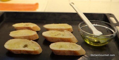 Brush the slices of bread with olive oil on both sides and put them on a baking sheet.