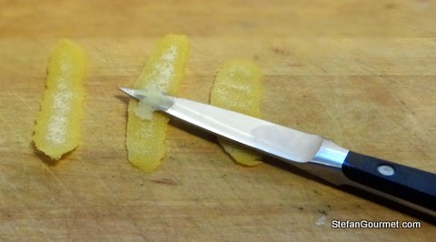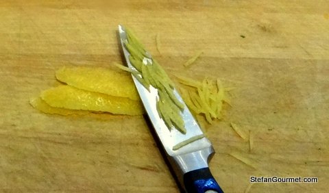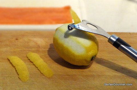 Usually I use a microplane grater to create lemon zest quickly and easily. In this preparation it is even more important than usually to use only the outer yellow rind and not the bitter white pith underneath. Therefore I used a vegetable peeler to peel off strips of the lemon rind.