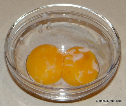 Put the egg yolks in a bowl and remove most of the white with a spoon or your fingers. Allow to cool to room temperature.