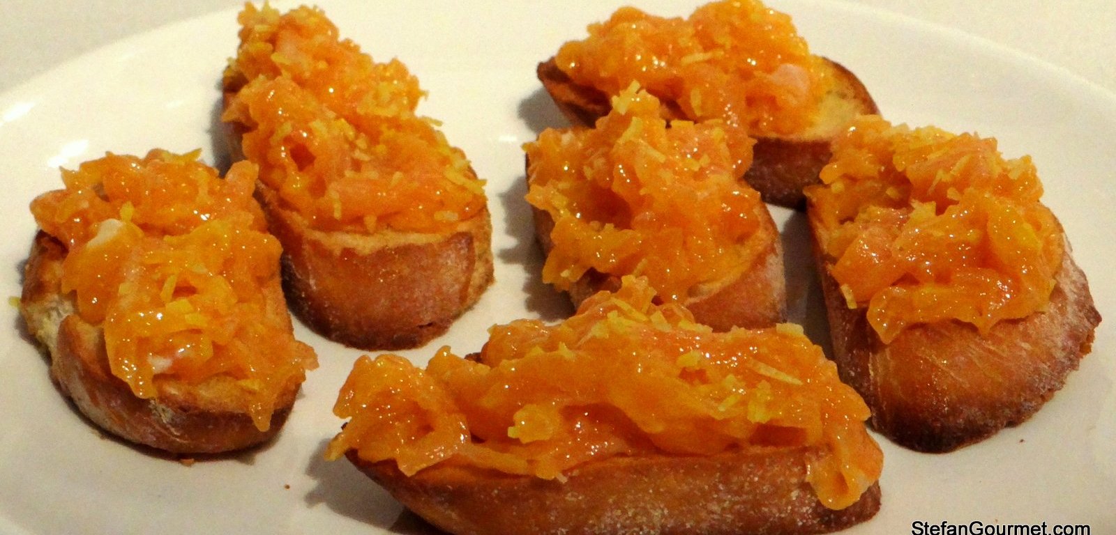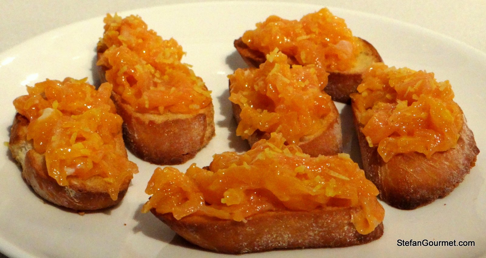 Today’s post was inspired by one of the appetizers served by Teun. He had cooked an egg yolk sous-vide at 64C/147F, which gives it a very nice smooth consistency. He served thinly sliced smoked salmon with lemon zest and the sous-vide egg yolk, and I loved the combination. The egg yolk adds a very nice creaminess to the salmon, whereas the lemon gives it freshness and makes it more interesting. To add an additional texture, I thought it would be nice to serve this mixture on crunchy crostini. Next time I will use a cookie cutter to make perfectly round crustless crostini to make it look more elegant, but otherwise I was very pleased with the result.