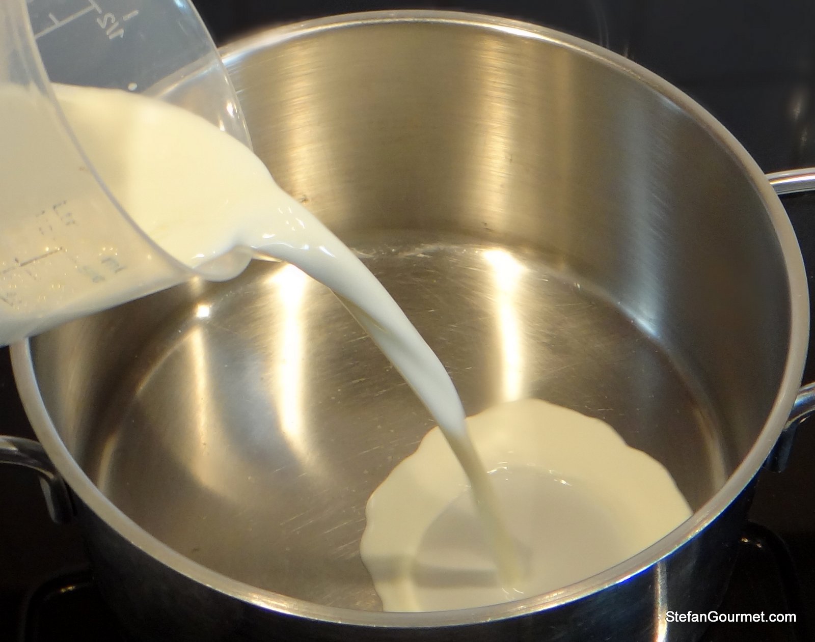 Start by making the pastry cream. Pour 300 ml cream and 300 ml milk into a saucepan and heat it without letting it boil.