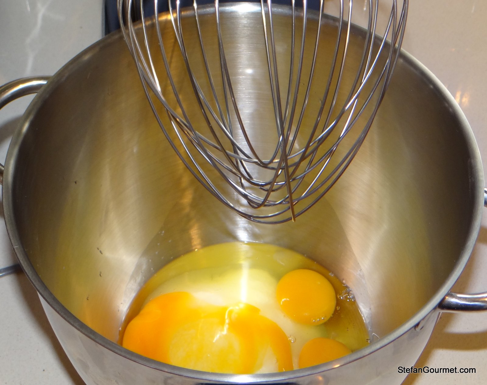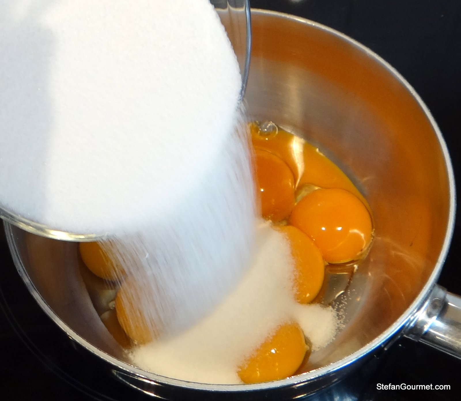 In a different saucepan off the heat, combine 8 egg yolks with 200 grams of sugar.