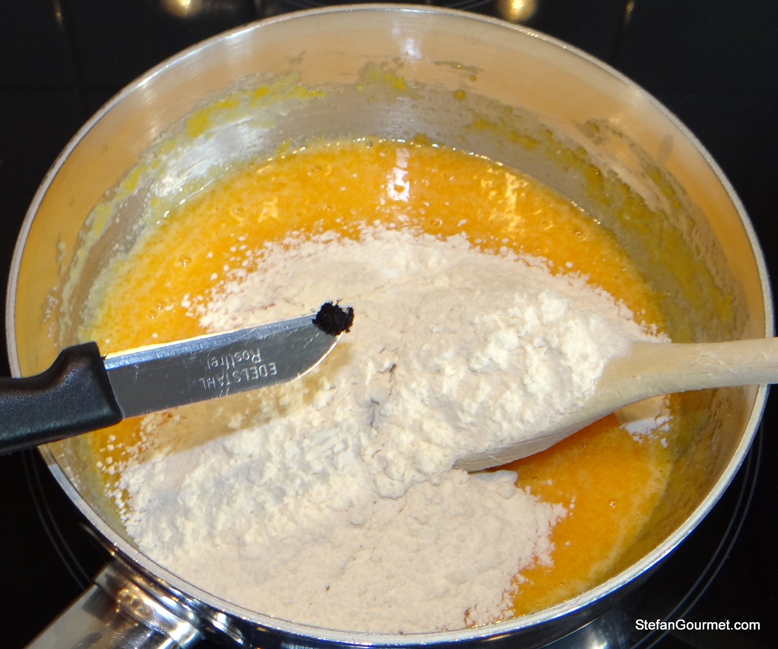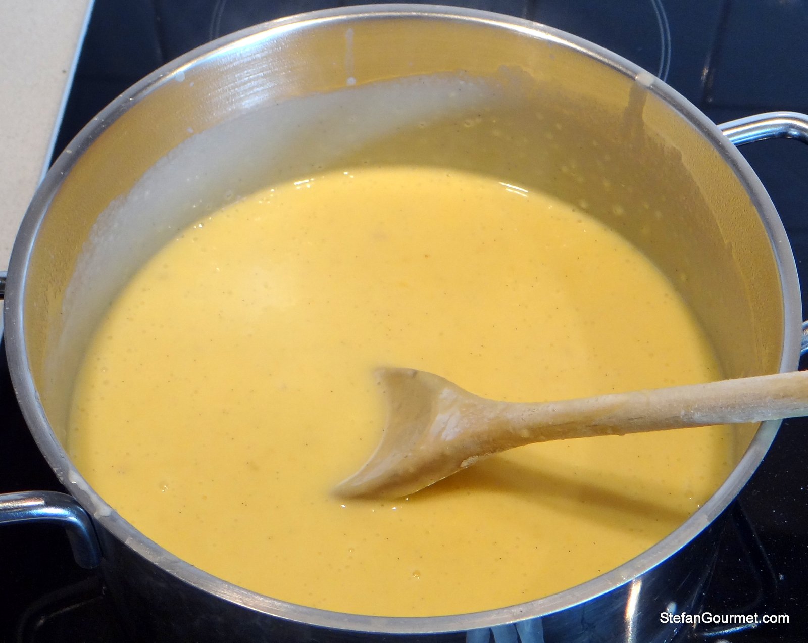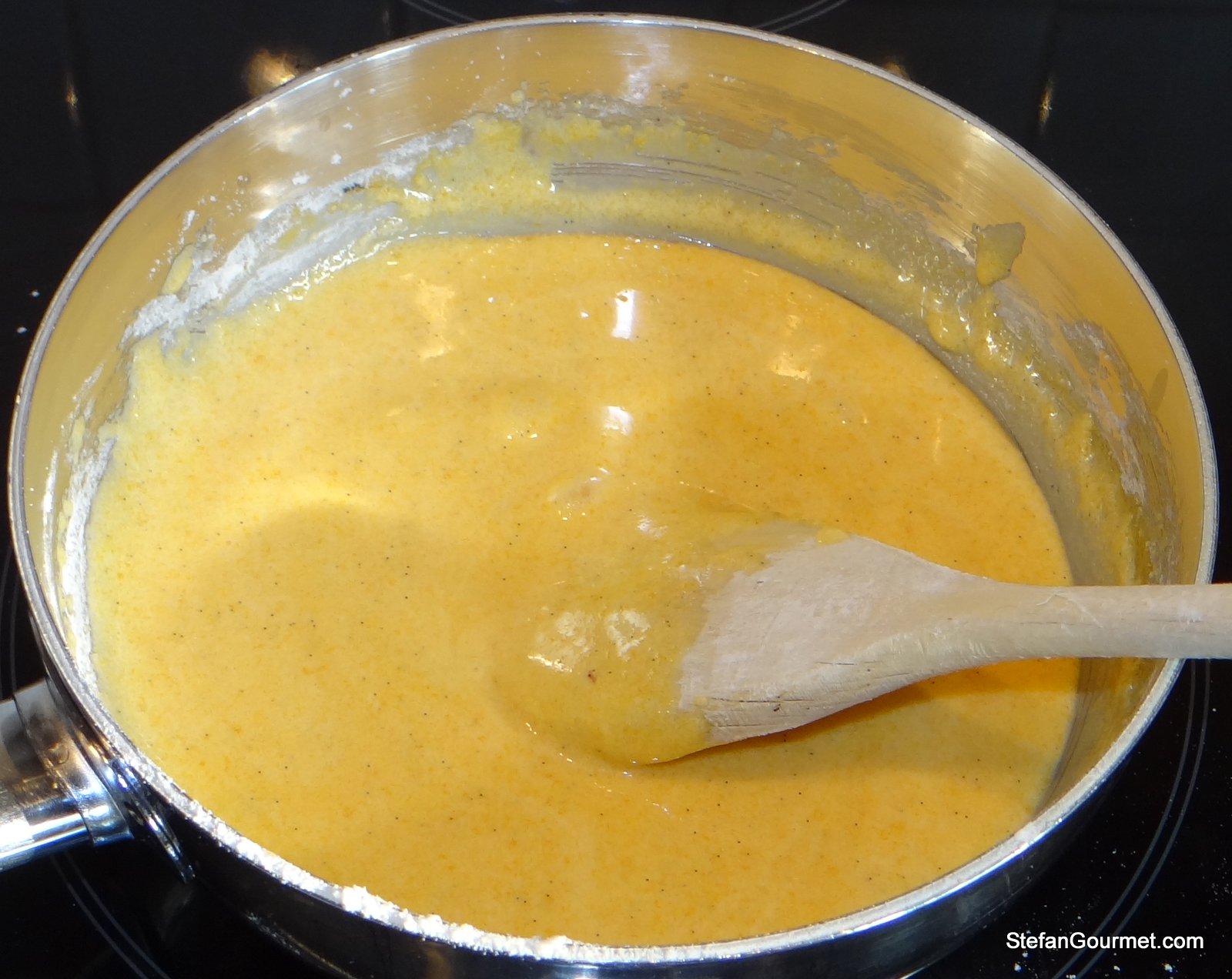Now turn on the heat to medium and cook the mixture, stirring, until it is nice and thick. Be careful that it doesn’t burn, but on the other hand allow it to become sufficiently thick (my pastry cream ended up a bit too thin).