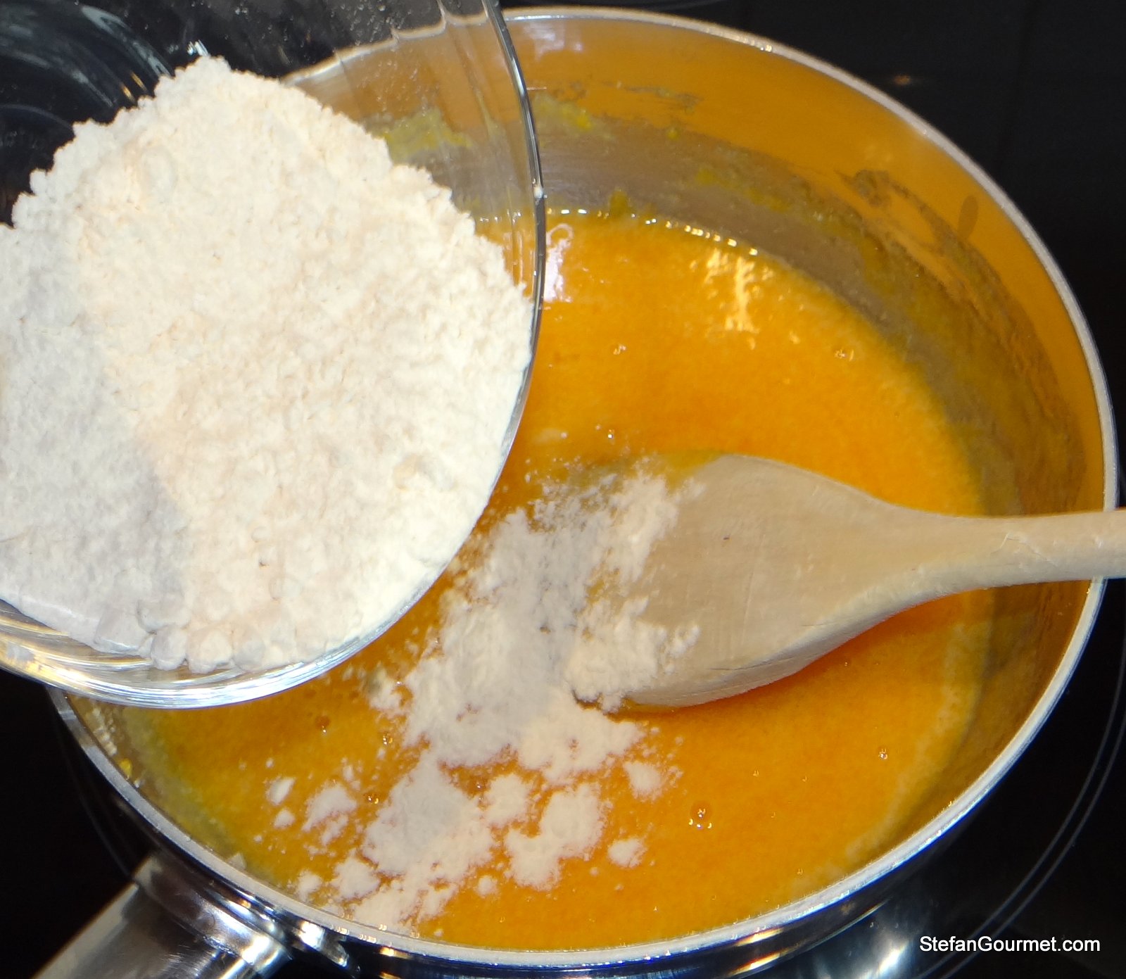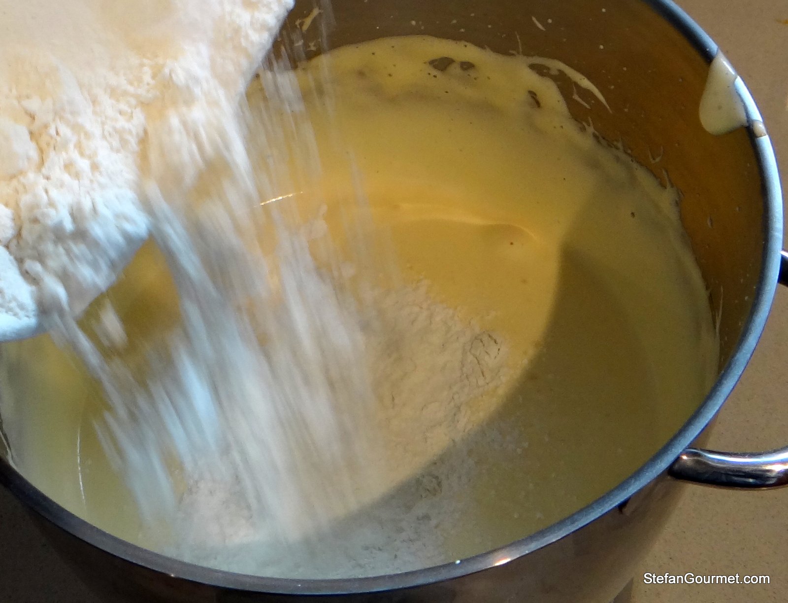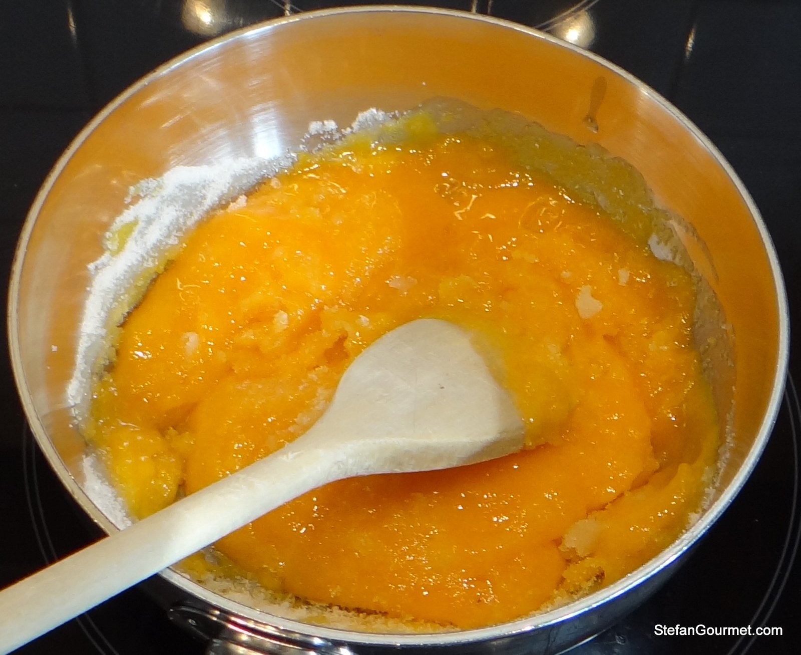Now turn on the heat to medium and cook the mixture, stirring, until it is nice and thick. Be careful that it doesn’t burn, but on the other hand allow it to become sufficiently thick (my pastry cream ended up a bit too thin).