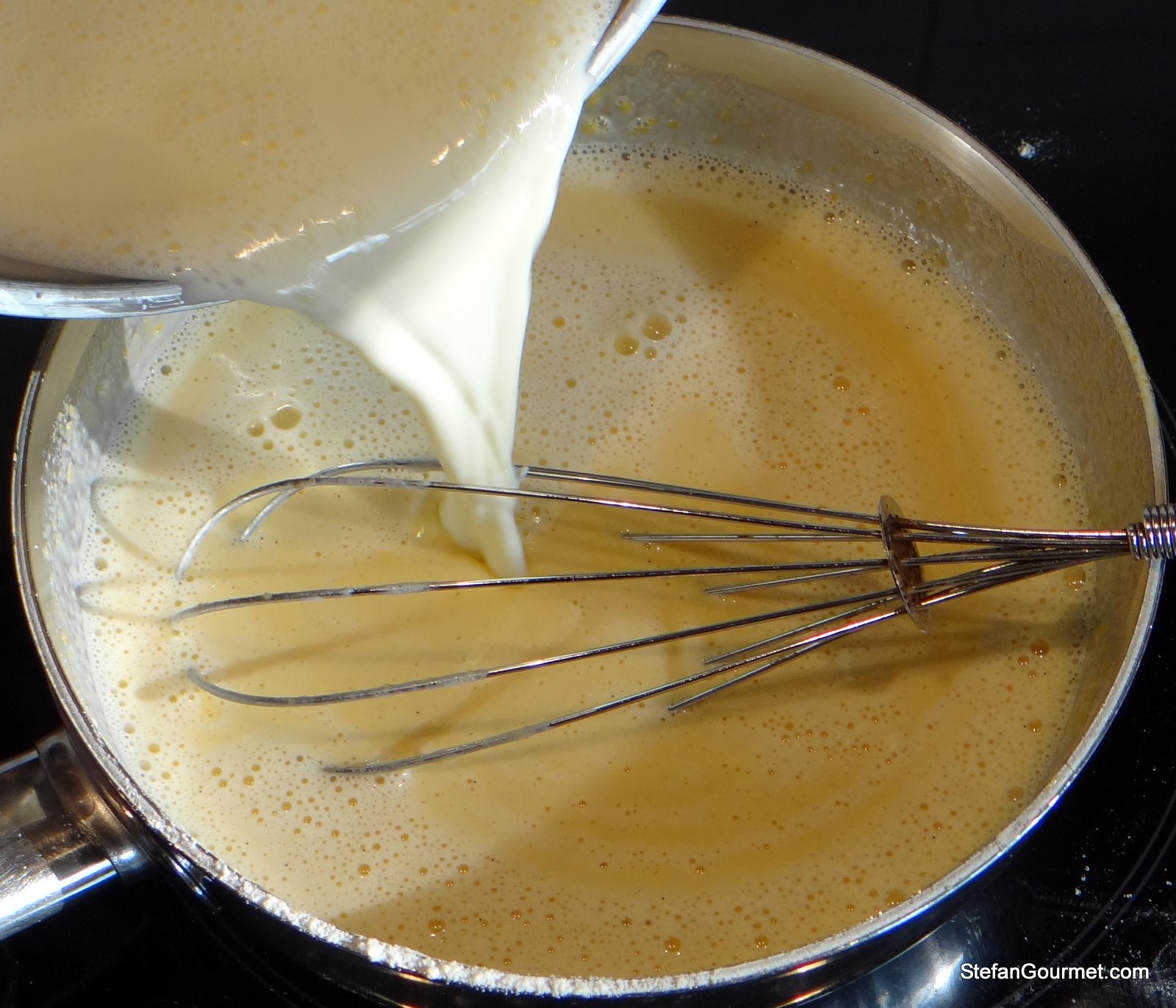 Add the hot milk and cream mixture slowly, beating with a whisk.