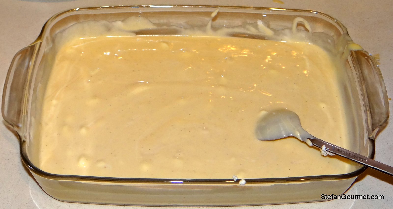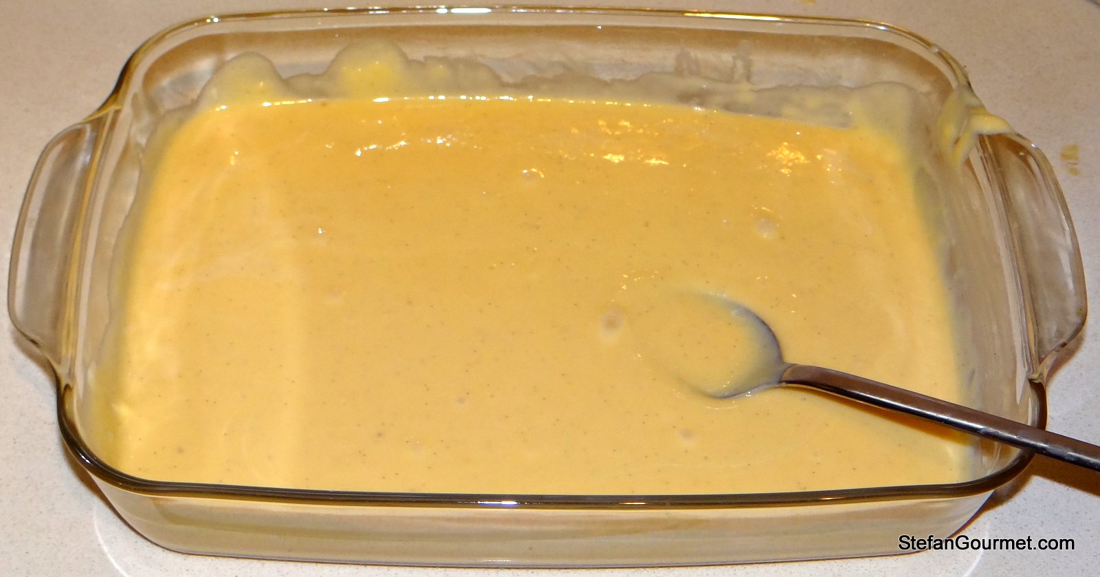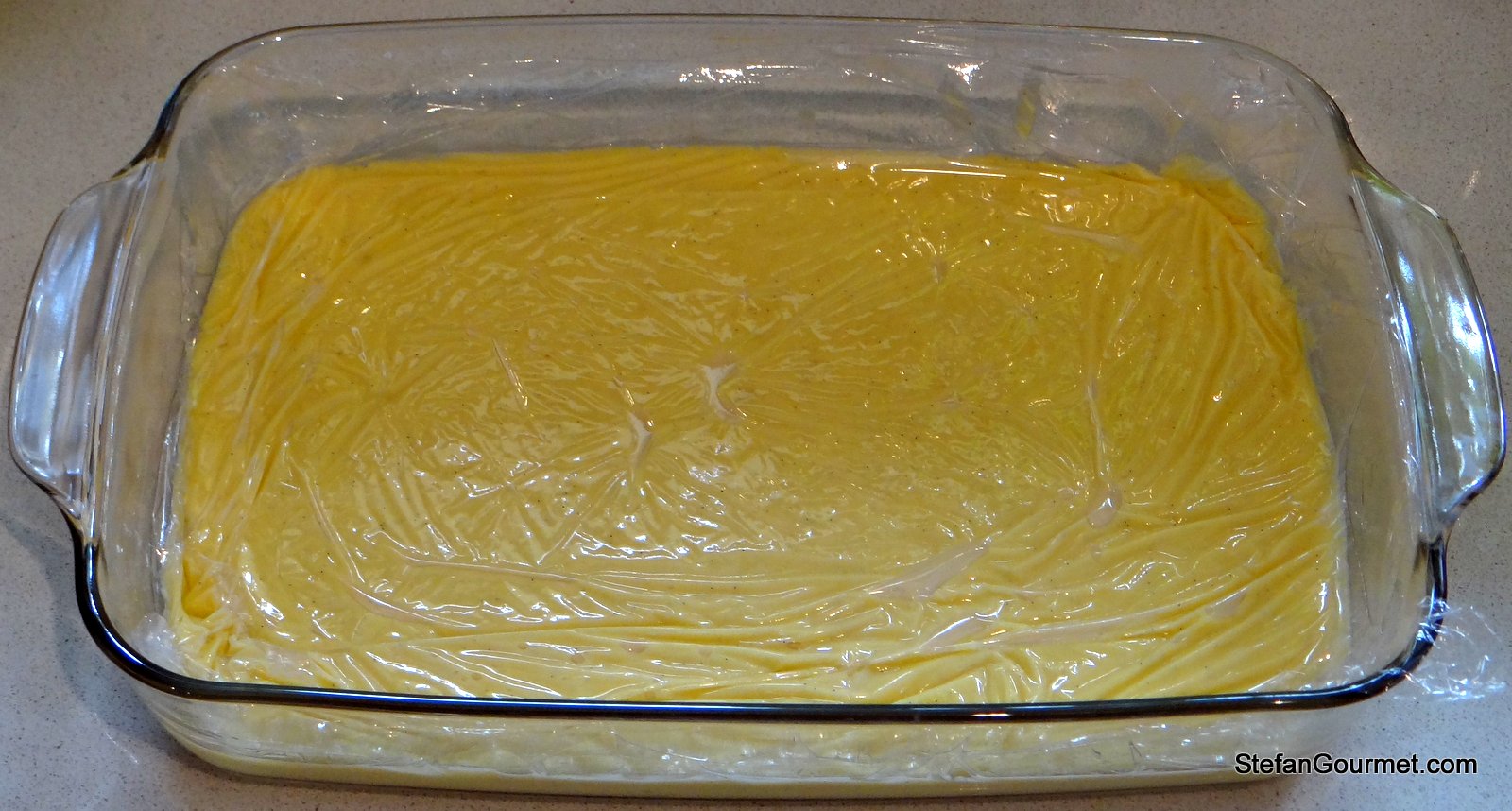 Pour the pastry cream into a wide shallow container such as a lasagne dish to cool. Cover with plastic wrap, pressing down the wrap onto the surface to prevent a skin from forming. Put it in the refrigerator to cool off completely.