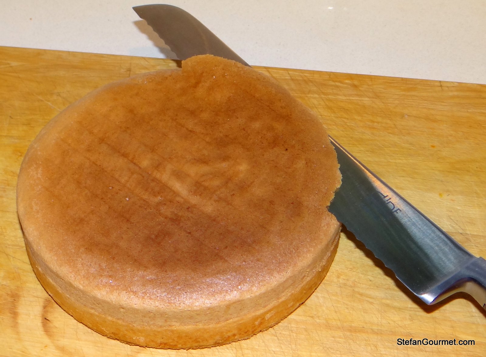 Cut one pan di spagna into three discs of equal thickness with a large serrated knife.