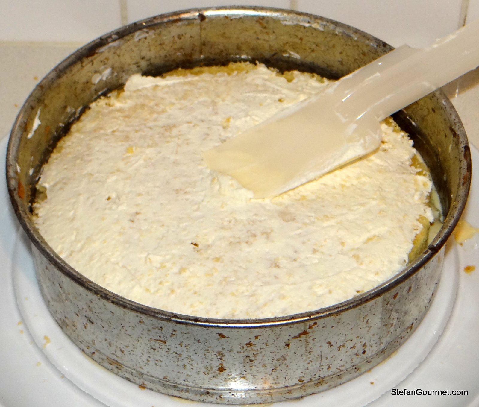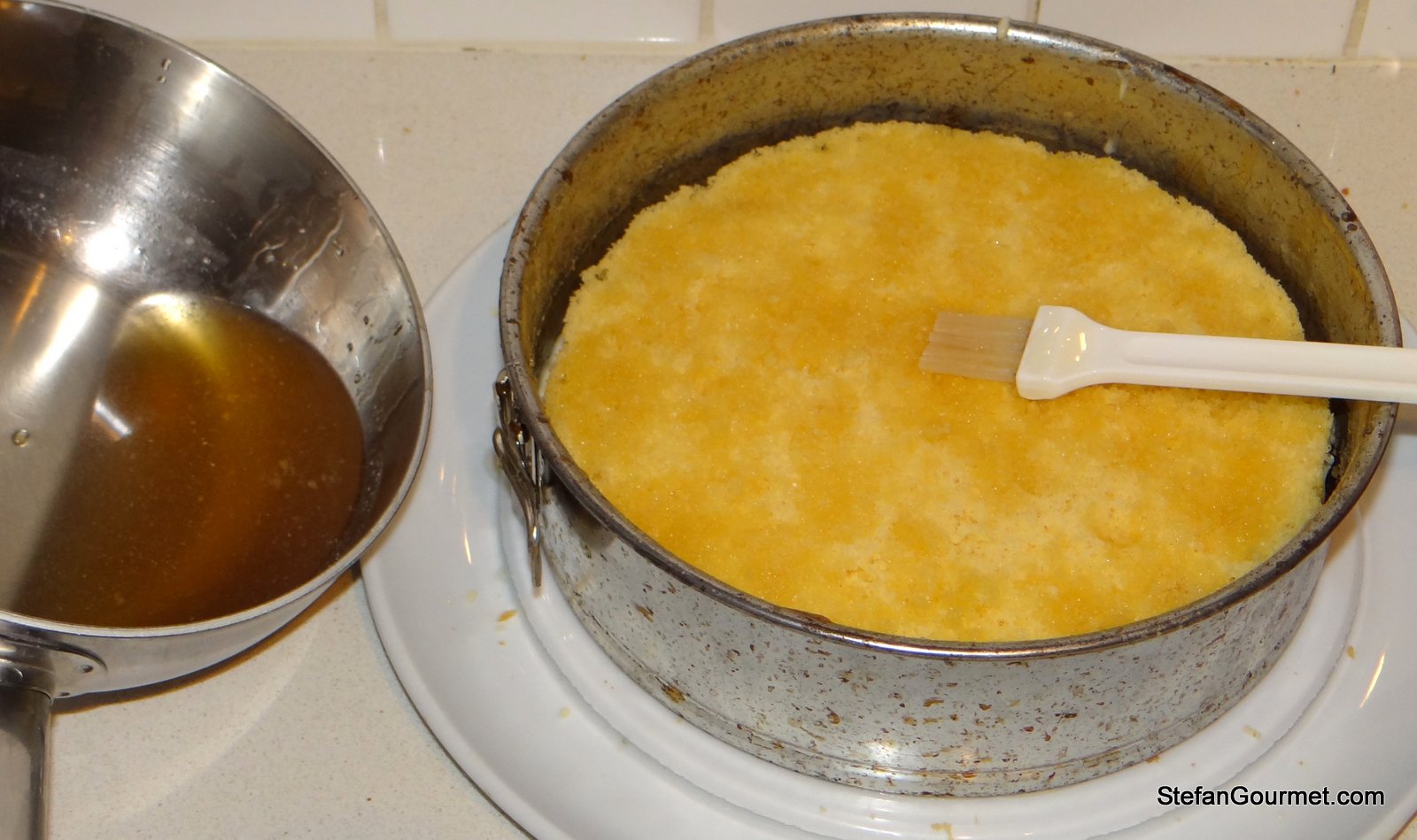 Put the first layer of the base of the cake on a plate. If you like you can use the sides of the springform pan to make it easier to keep the cake straight. Drench the base of the cake with the syrup.