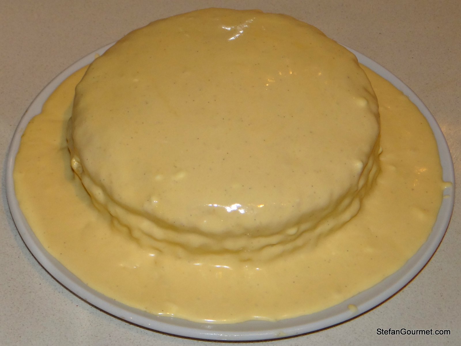 Repeat with the other two layers. Then cover also the sides of the cake with the pastry cream. As you can see my pastry cream was a bit too thin, but the cake turned out fine anyway.