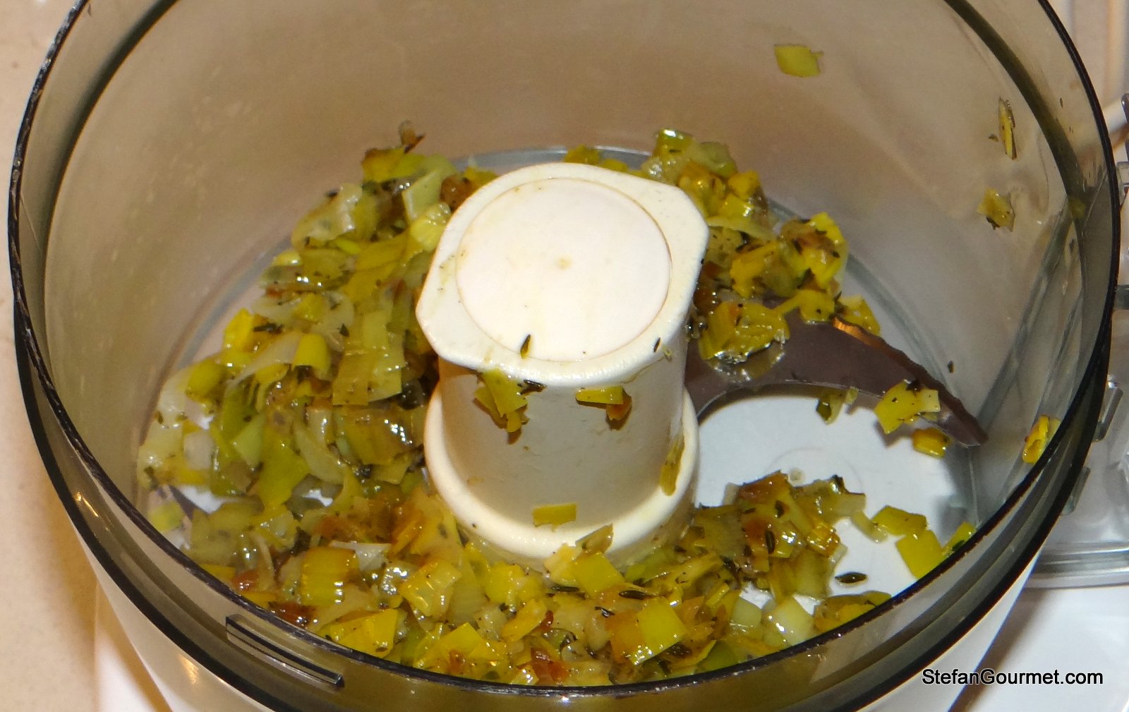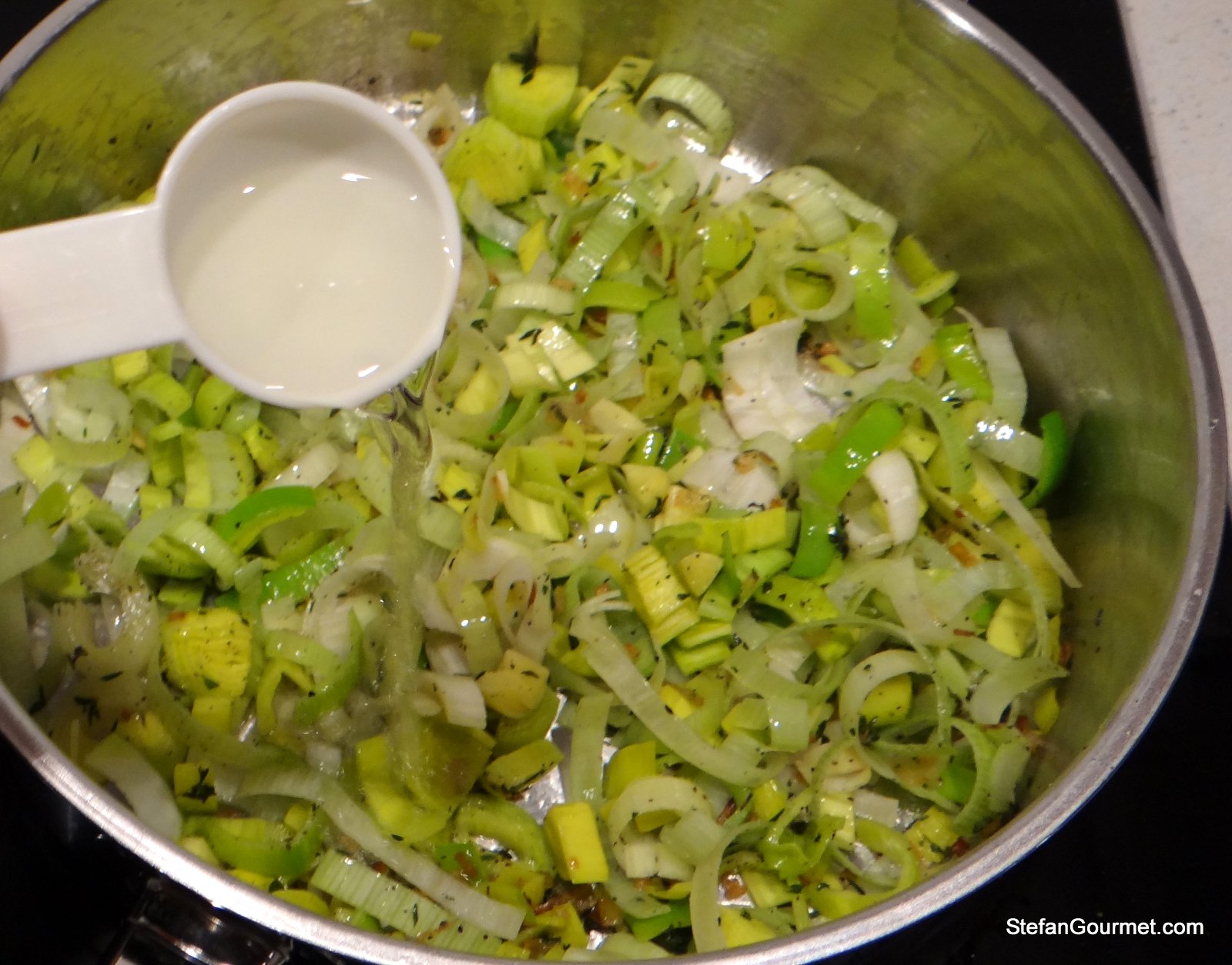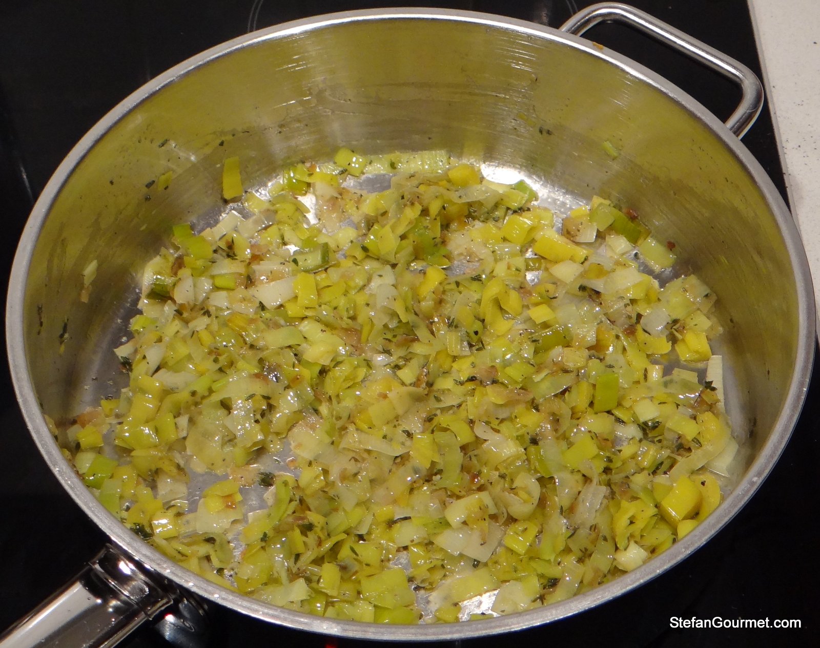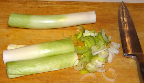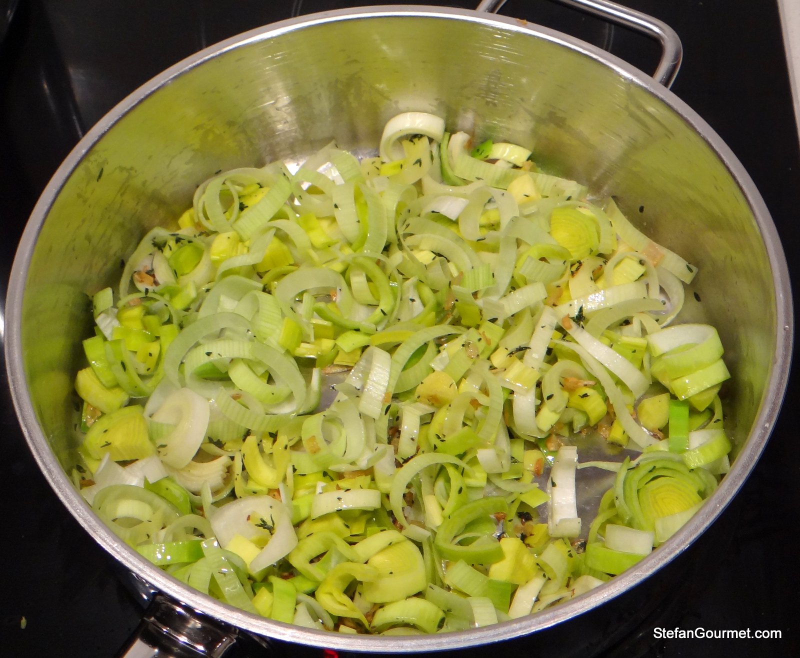 Use only the white and light green part of the leeks. Cut in half lengthwise and then slice thinly (4 mm – 1/6 inch).