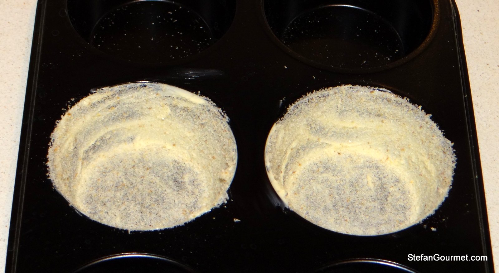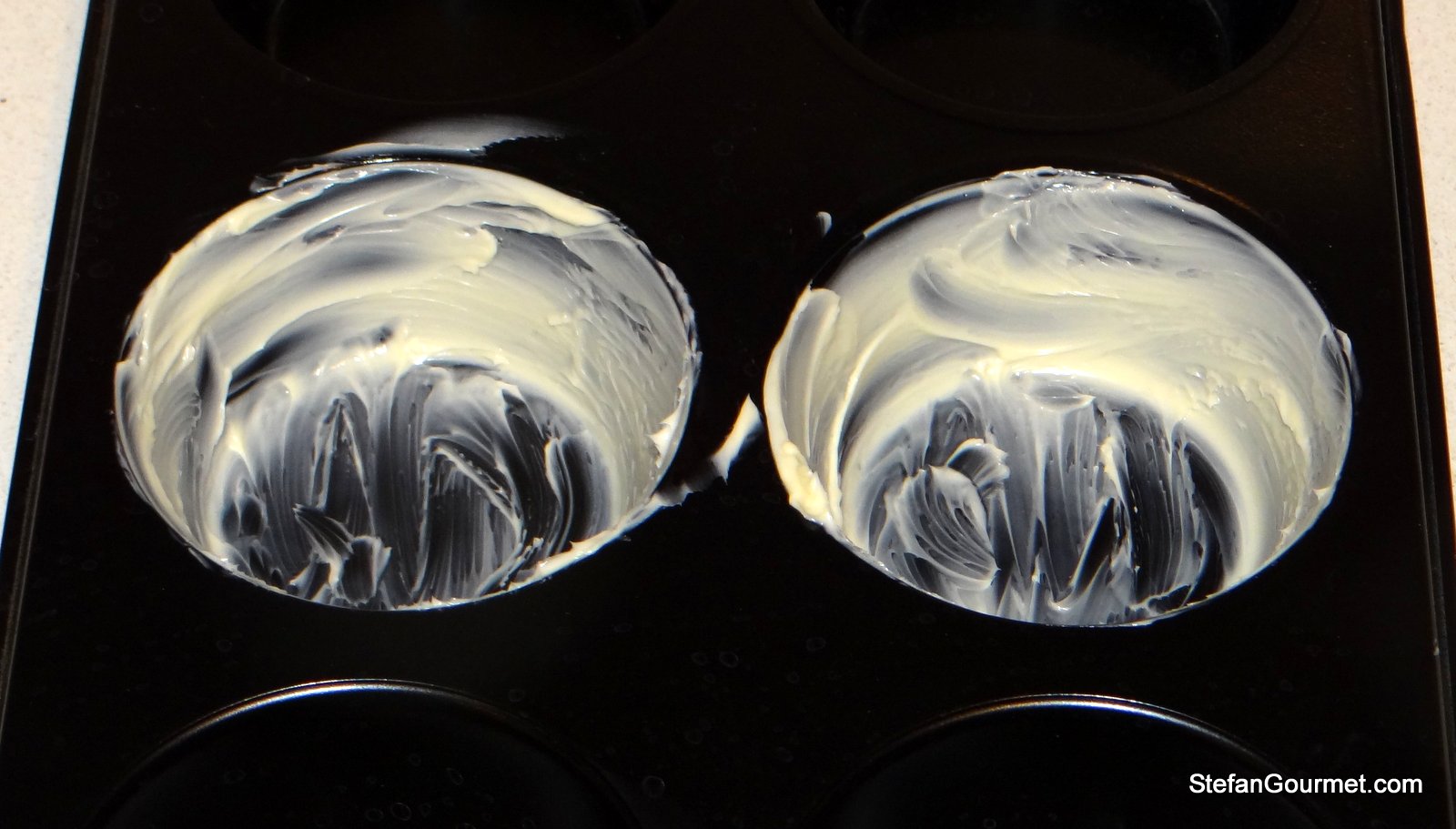 Butter 4 positions in a muffin pan. (Each muffin holder should be about 100-120 ml, 1/2 cup or a bit less. You can also use ramekins of that size.)