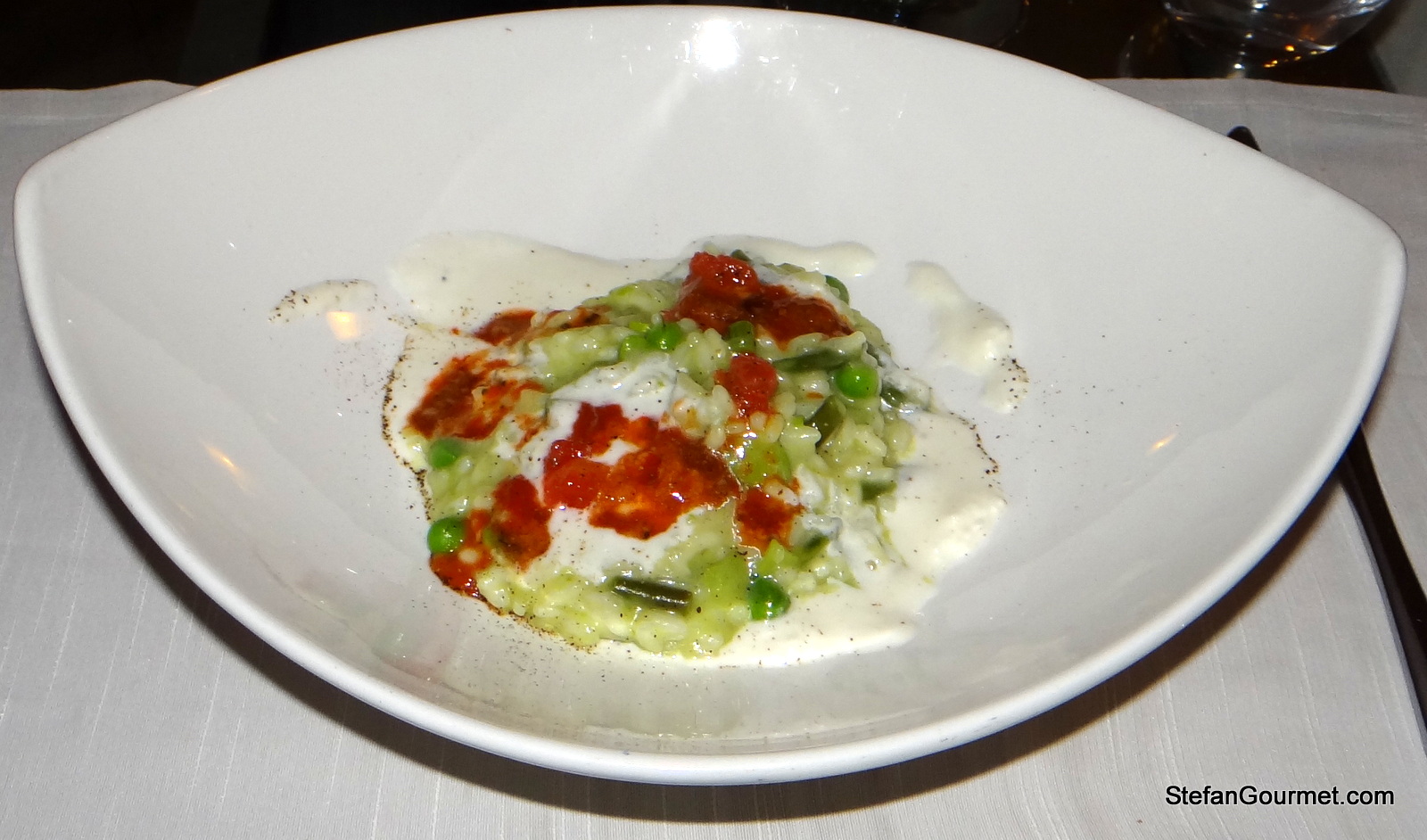 The first primo is rice with vegetables, creamy burrata cheese, and sea urchin. The dish is nice but for a very bitter note — the fava beans? The sea urchin pairs nicely with the burrata, the rice and the vegetables. 7/10