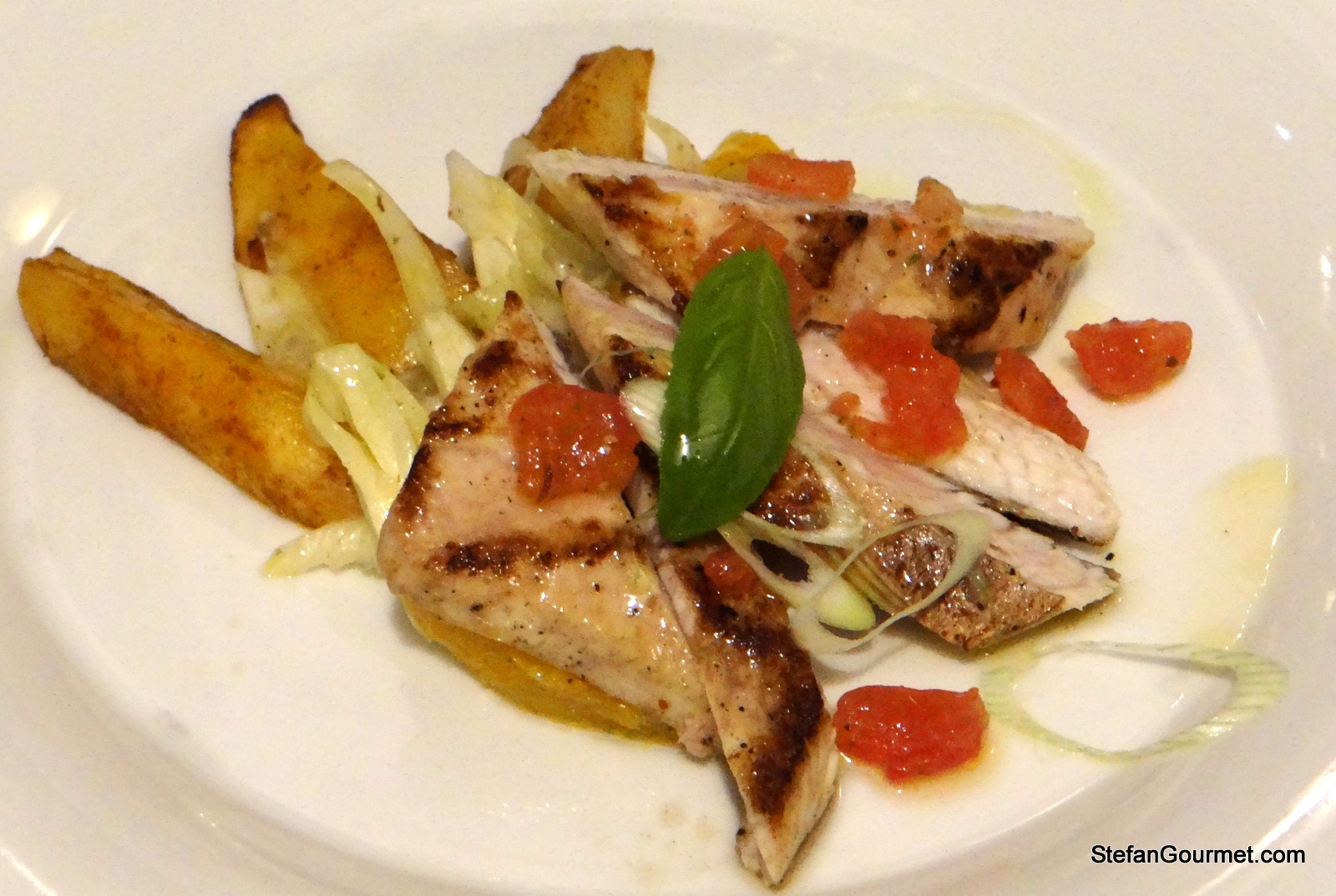 The ricciola returned in the secondo: the belly seared on the grill served with oven-roasted potatoes, fennel salad, and blood orange. The fish was cooked perfectly (still pink inside), very tender and juicy, and paired very well with the salad. 9/10