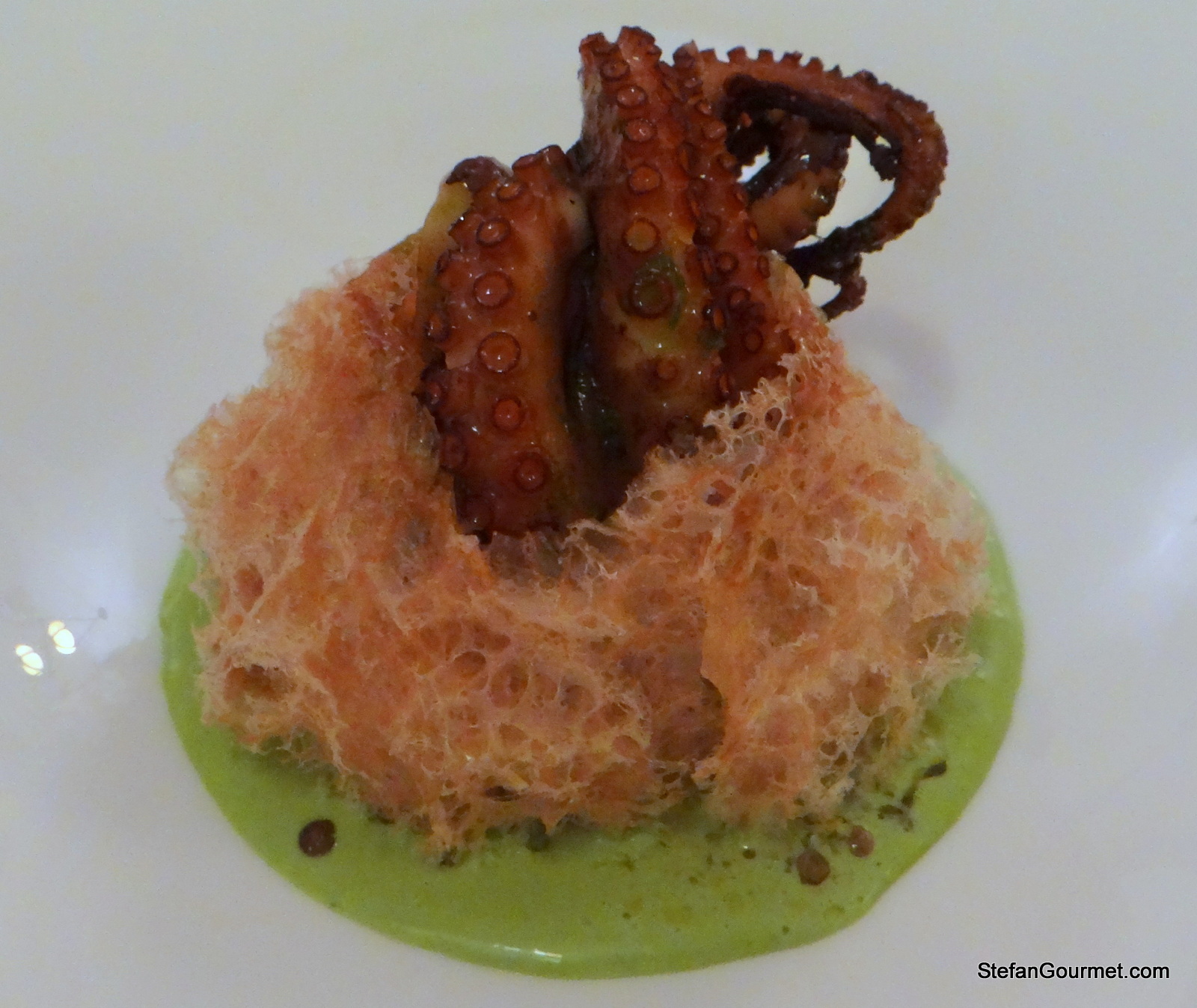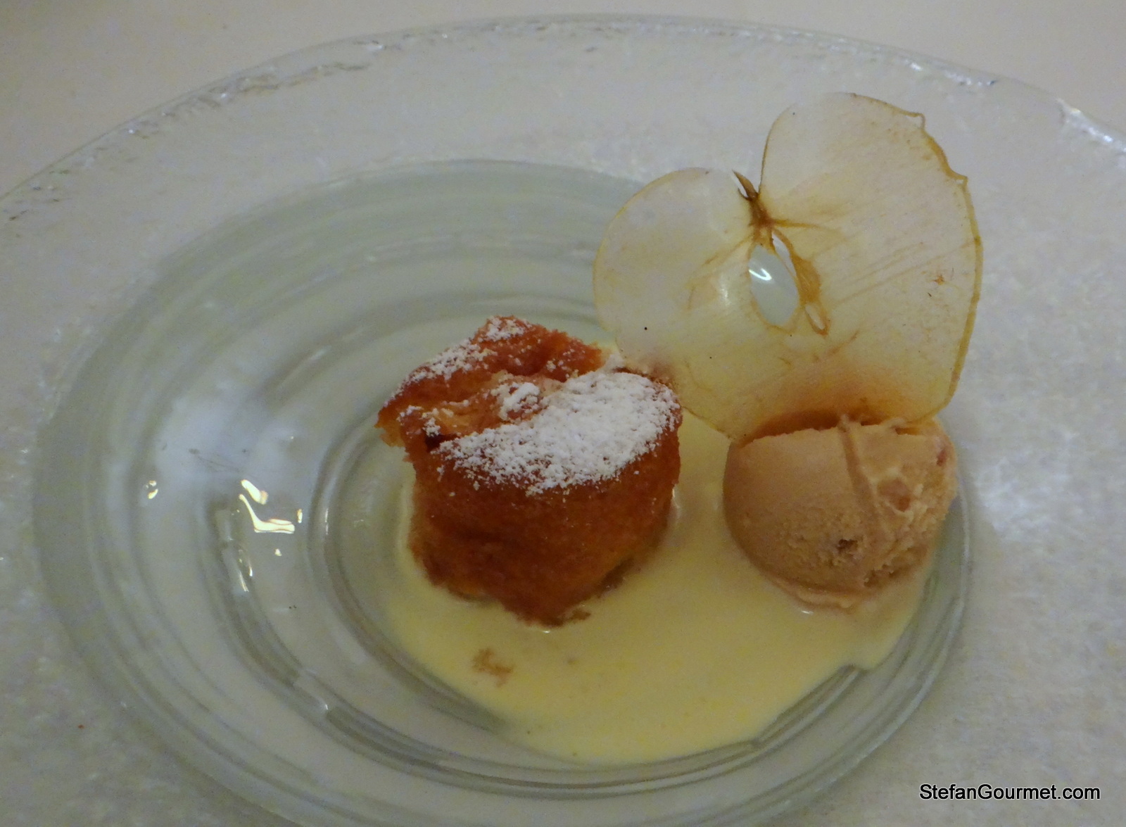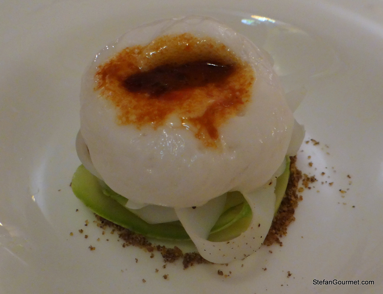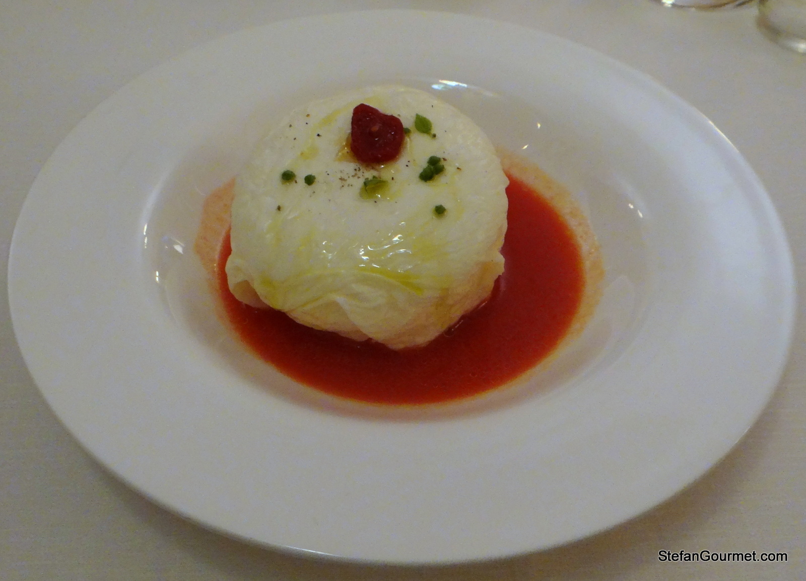 We weren’t fooled as easily the second time, so we immediately assumed that this was not a whole ball of mozzarella. And we were right, because it was reconstructed destructed mozzarella. It had a very nice flavor of buffalo mozzarella, but with a feathery texture. Even the ‘skin’ of the mozzarella looked real, and it was served with a great tomato coulis. The flavors, textures and lightness were again amazing. 10/10