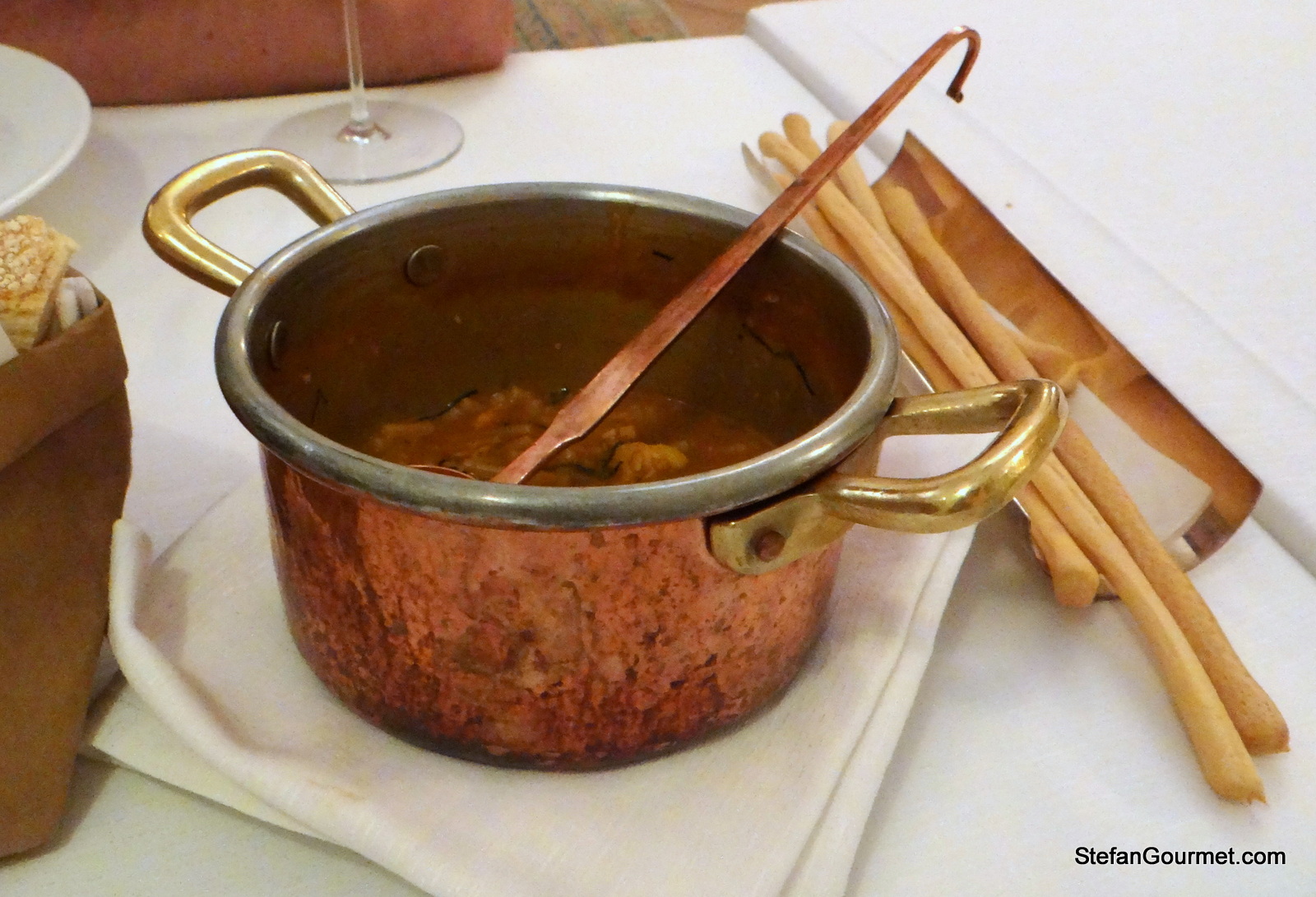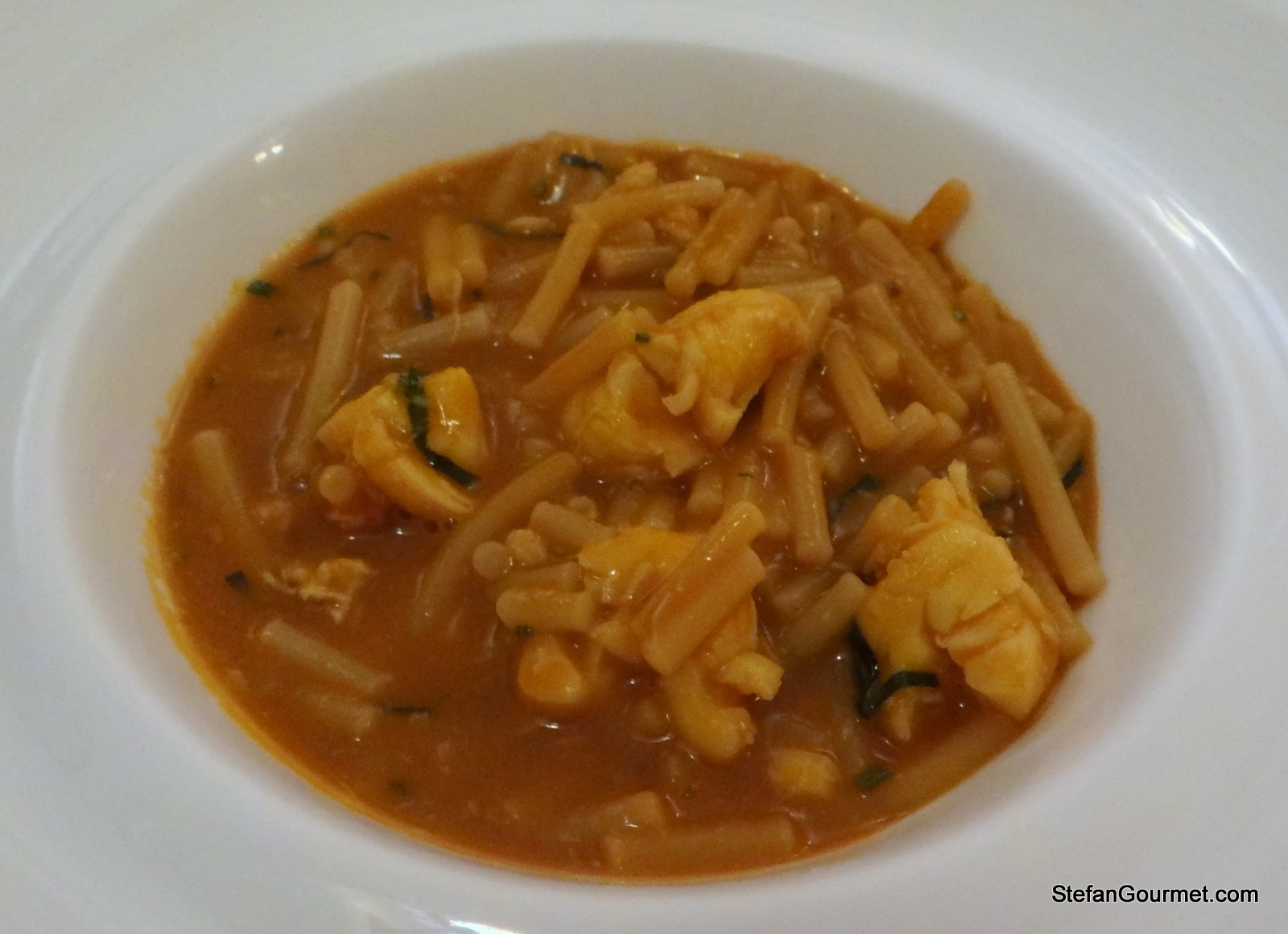 Pasta e minestra di crostaceo. After all the very interesting and light antipasti, this is a very substantial dish that is loaded with flavor. The stock is very concentrated prawn stock with a very good balance between a wonderful strong prawn flavor and some chile pepper. The pasta is al dente and there are some morsels of perfectly cooked juicy fish in there. 10/10