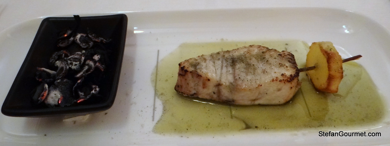 Tataki di pesce Sikano. A piece of ricciola, prepared Japanese style: chargrilled on the outside, and still raw on the inside. Very fresh fish with a great flavor and texture. A dish with smoldering almonds is added for the scent, and there is a slice of potato fondant that is very soft on the inside and crispy on the outside. You guessed it, another 10/10.