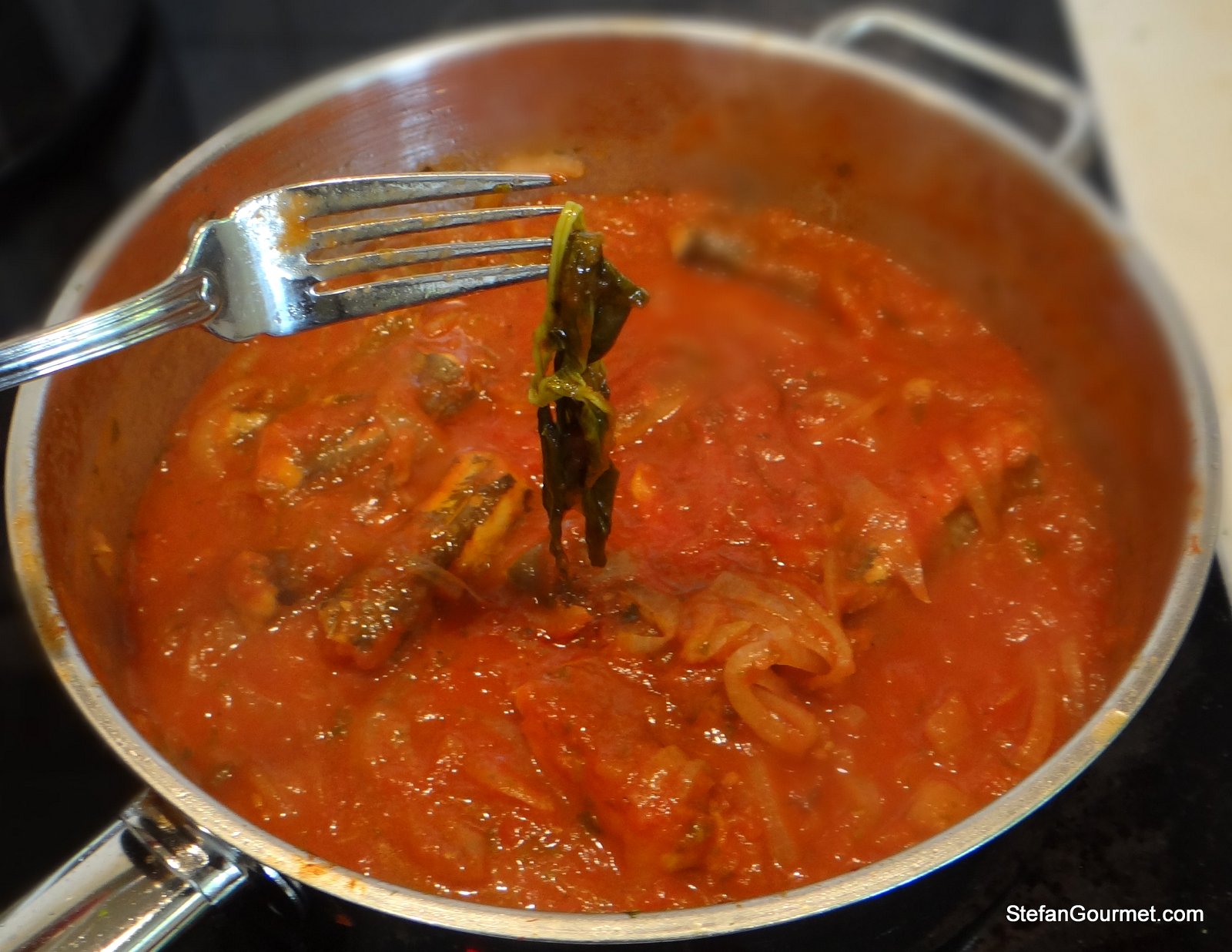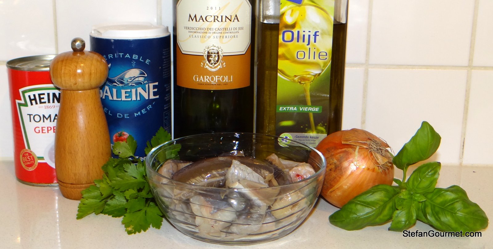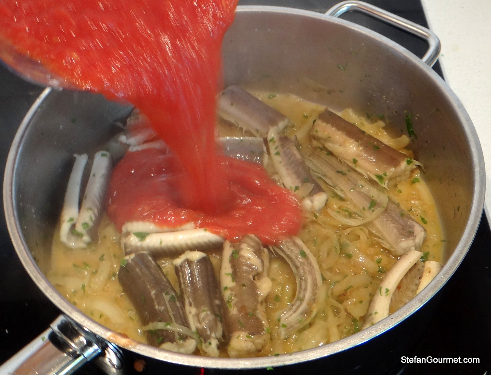 Eel is caught locally in the area where we live and we love smoked eel. Eel is also available fresh to be used for stewing, but I don’t care much for the Dutch/Flemish preparations. My curiosity was piqued though when I saw a post by ChgoJohn on eel stewed in tomato sauce Italian style (or to be more precise, in the style of Le Marche). I did some research and it turned out that this dish is known as Anguilla in Umido in most of Italy, and that it originated in Campania, the region of Naples. Anguilla in Umido is traditionally eaten between Christmas and New Year’s as a symbol to drive out the evil for the New Year. Eel looks like a serpent, and by eating it you conquer it. How simple was life back then.