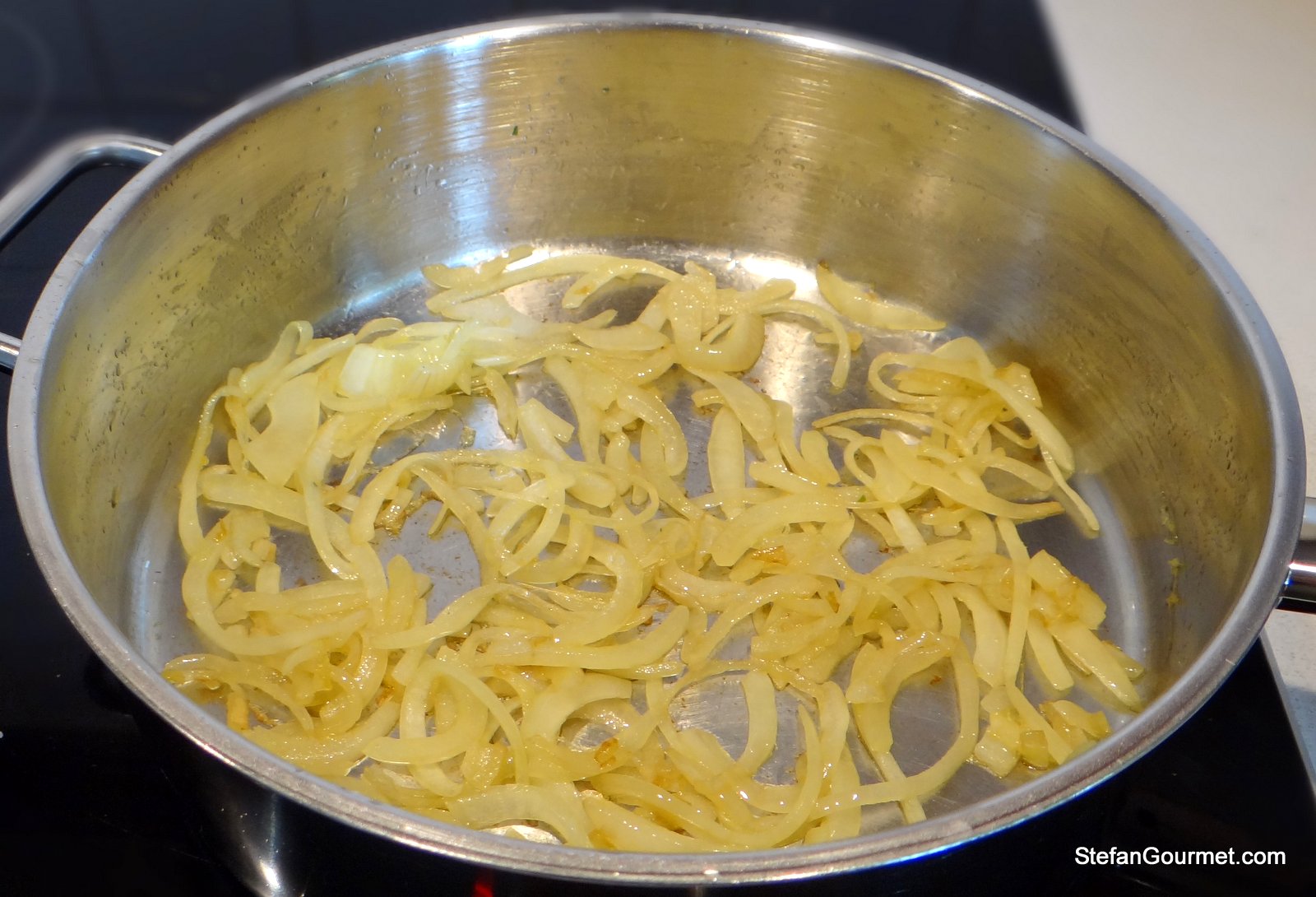 Heat a tablespoon of extra virgin olive oil in a frying pan or Dutch oven. Add the sliced onion and cook over low heat until the onion is soft and golden, about 10 minutes.