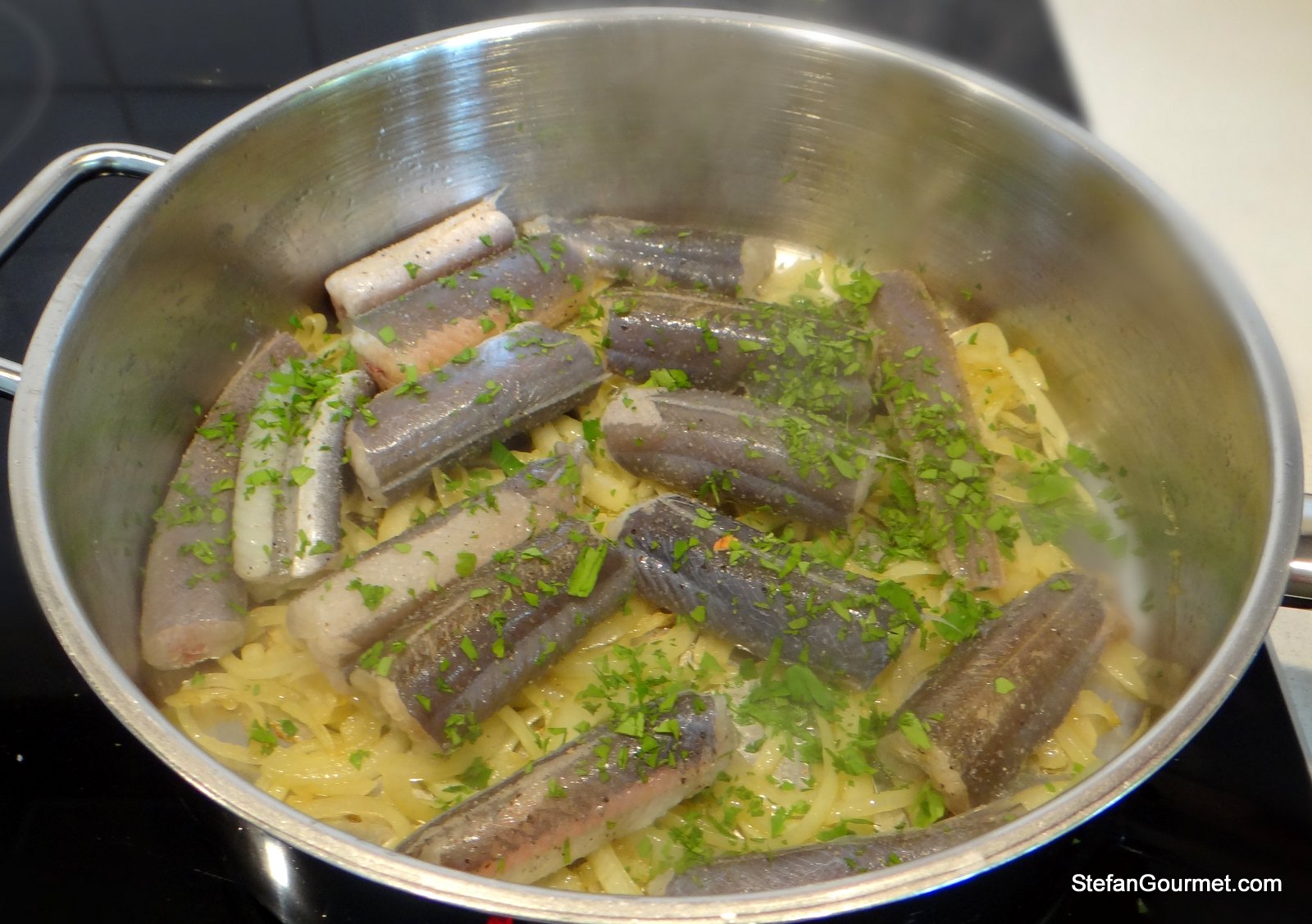 Increase the heat and add another tablespoon of olive oil. Add the eel and the parsley and sauté gently until the eel is slightly cooked on all sides (about 2 minutes).