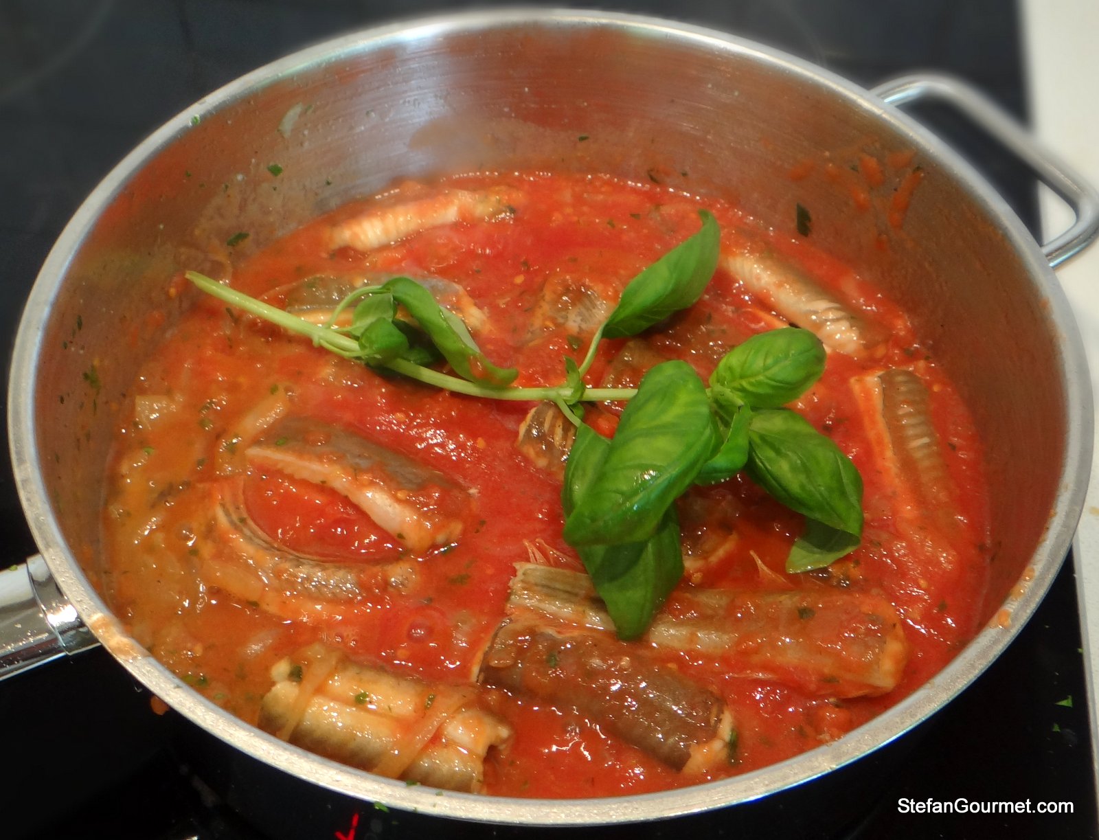 So why am I preparing this dish in summer? Because fresh eel is available around here between May and October only, that’s why. And this year because of the cold, I only noticed eel at my fishmonger for the first time last week. It was very expensive (because eel is starting to become scarce), but I’m glad I bought it anyway because prepared this way it was absolutely delicious! The eel gives off a very nice flavor to the tomato sauce, the eel is tender and juicy without tasting too greasy, and the flavor of the eel is not at all overpowered by the tomato sauce.