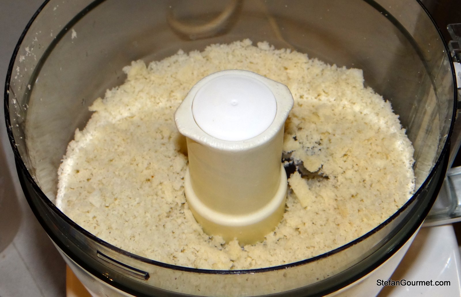 Make the breadcrumbs by grinding Italian or French bread in the food processor. It is okay if the bread if slightly stale.