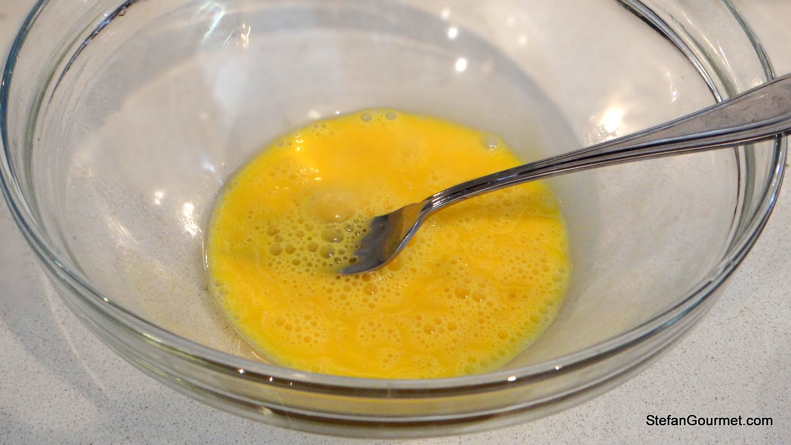 Beat the eggs in a bowl.