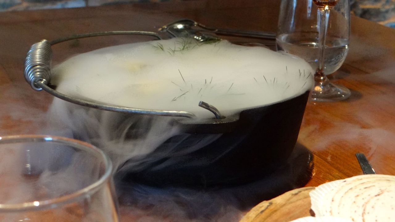 Oyster with wild fennel and passion fruit, served with dry ice for effect. Nice combination of flavors, although a bit less passion fruit would have given the fennel more opportunity to shine.