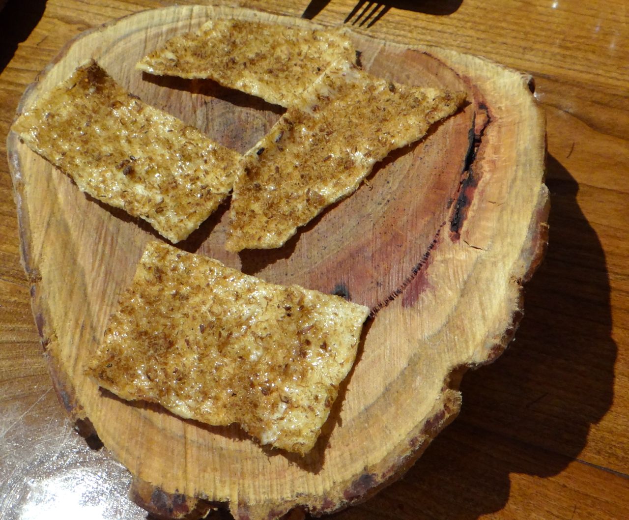 Tapioca with mushroom floss and mustard oil. Very crispy and very nice. It reminded us of pork crackling.