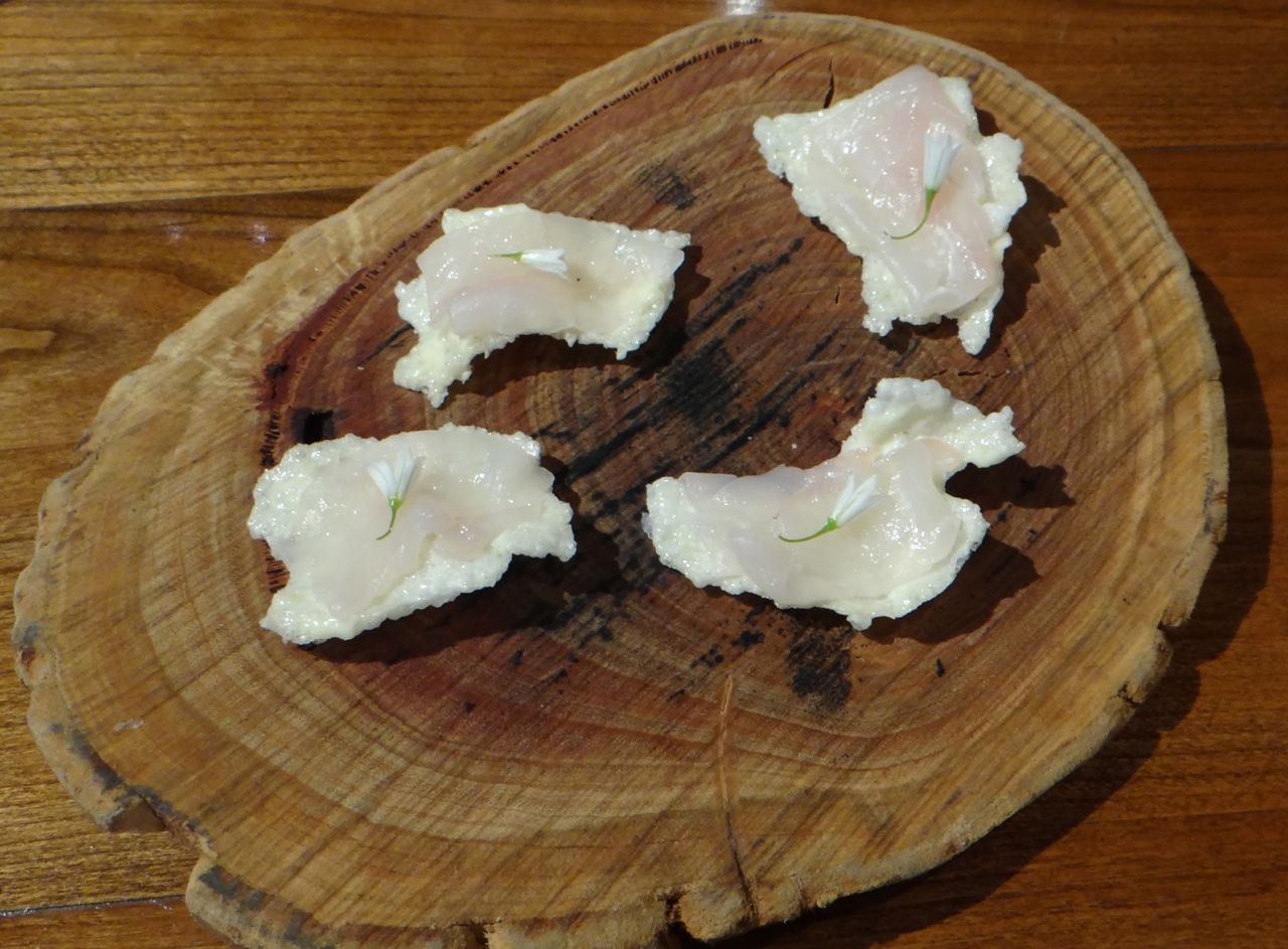 Rice crackers with blue eye cod and wild garlic flowers. Again very nice, a small explosion of flavor. 8/10 for the set of amuses, which did not come with a paired wine.
