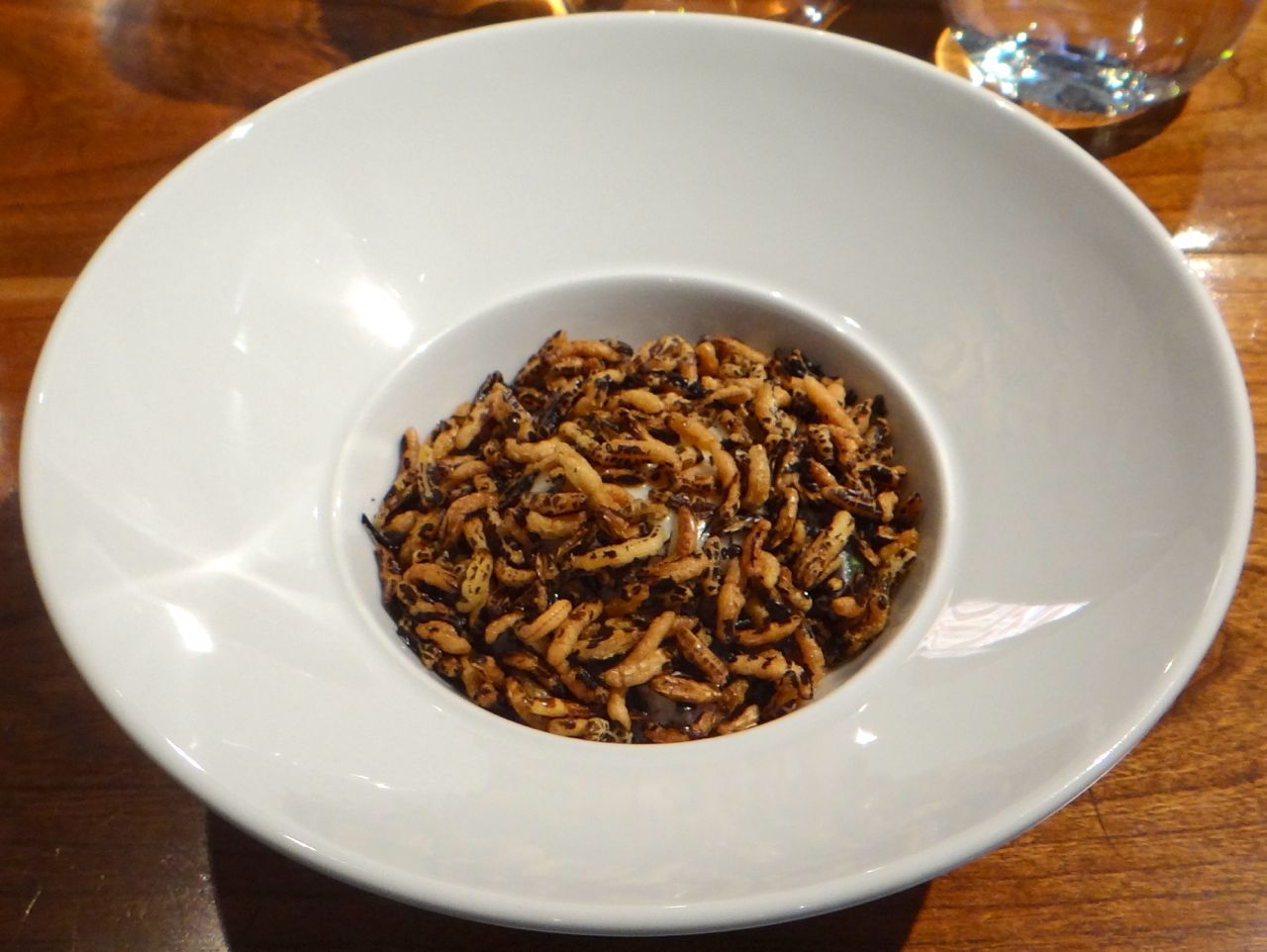No, this is not a bowl of maggots but popped wild rice with tuna, parsnip, and lemon. It paired well with the 2012 riesling, although a lighter riesling might even have worked better. The crispy rice contrasted very nicely with the raw tuna. The parsnip did not taste very strongly of parsnip, but a very nice dish all the same. 8/10