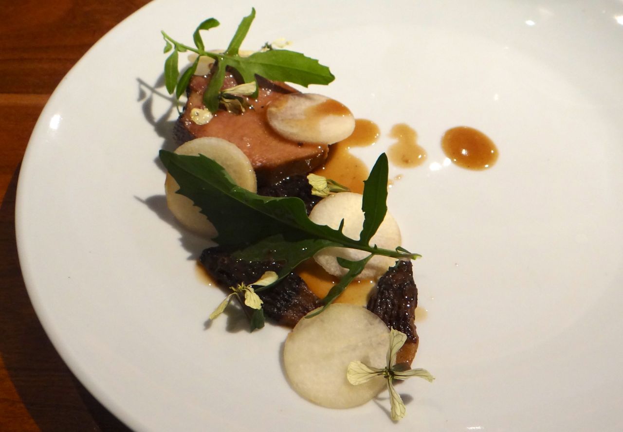 Squid in a leek soup with chives, wood sorrel, and linseed. The squid provided more texture than taste, it was almost like eating noodles. The combination with the linseed and leeks worked very well, and the pairing with the 2011 grenache rose was the best of the evening. It was also interesting that the flavor of the dish seemed to change as you ate it. 9/10