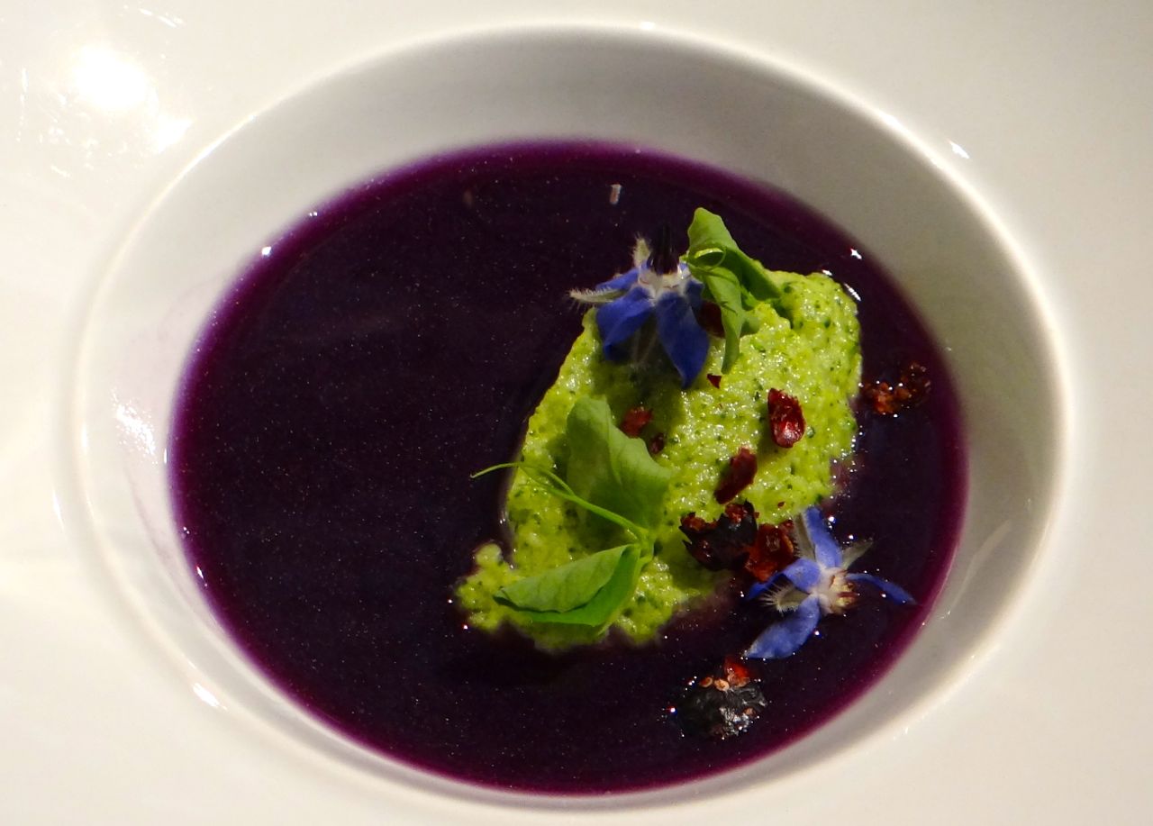 Broccoli puree with red currants, red cabbage soup, and pea shoots. The acidity of the 2012 Stray Mongrel Grenache-Shiraz-Zinfandel was a bit too high for the red cabbage, but the combination of red cabbage and broccoli worked very well. 8/10