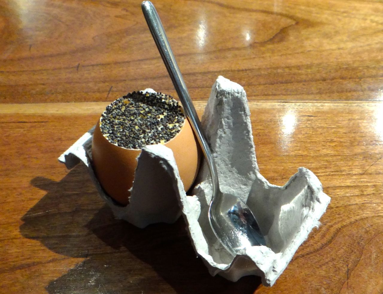 An egg filled with a yogurt and orange mousse and topped with poppy seeds. I liked the presentation in the egg carton.