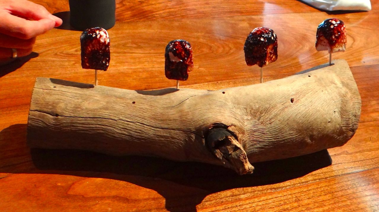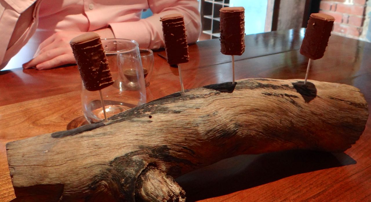 Dark chocolate and cranberry pops in the shape of the logo of the winery and restaurant. The treats are served with a fresh mint infusion.