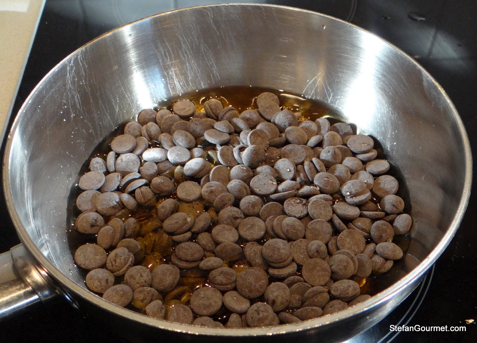 Combine the chocolate chips with the amaretto and water in a saucepan and melt the chocolate over low heat. You can do this au bain marie if you prefer, but that is not necessary if you have a good saucepan and good heat control.