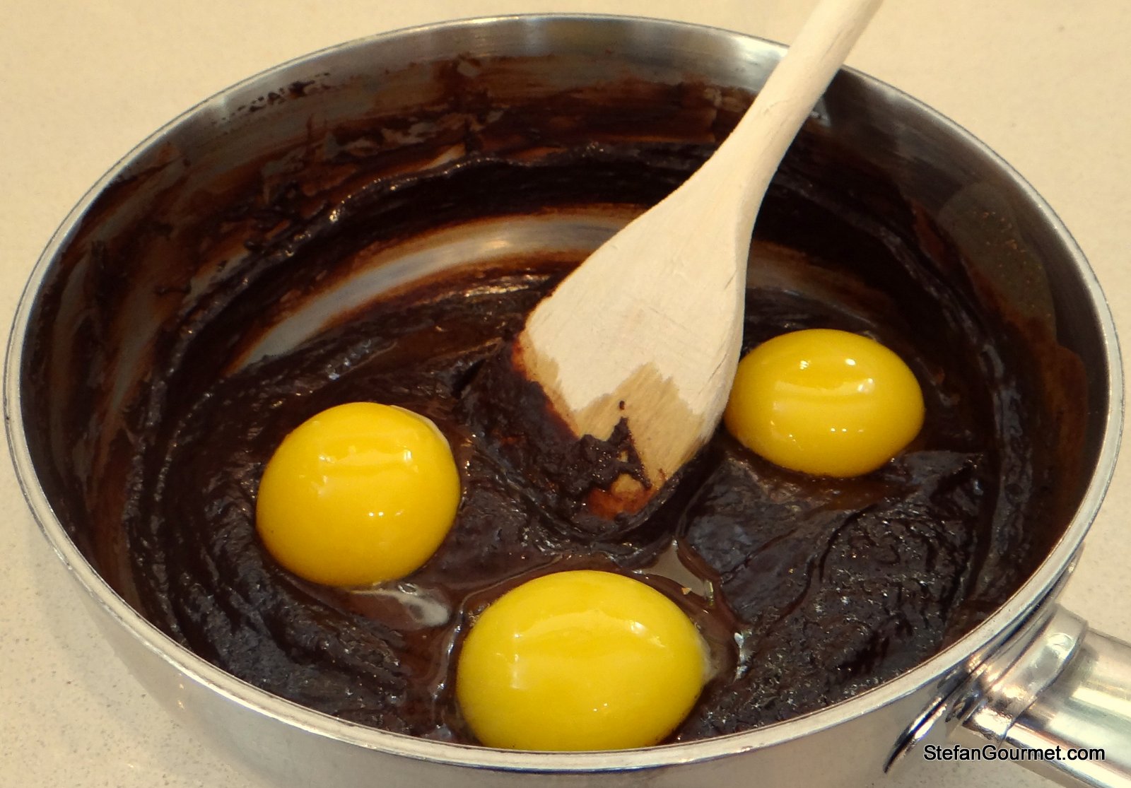 Stir in the egg yolks until the mixture is smooth again. The egg yolks will make the mixture it nice and shiny.