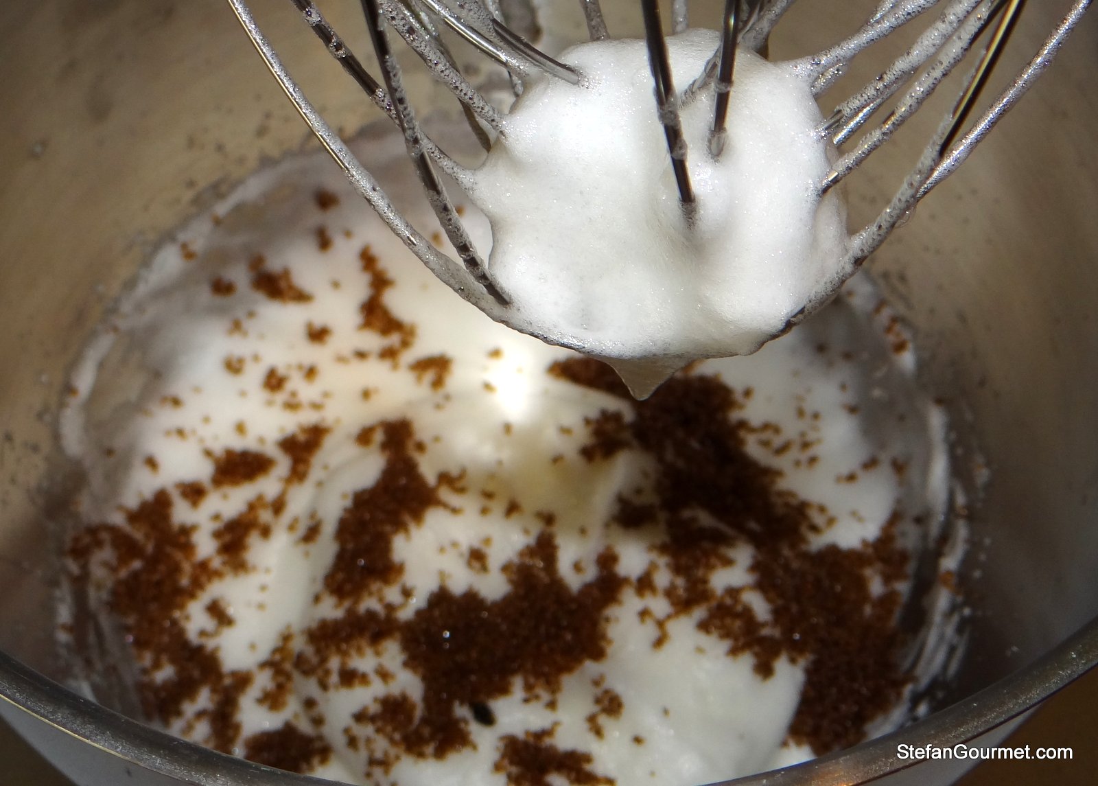 Continue to whisk until the ‘soft peaks’ stage. This means that when you extract the beaters, you will see peaks that will sag a little rather than be firm and upright.