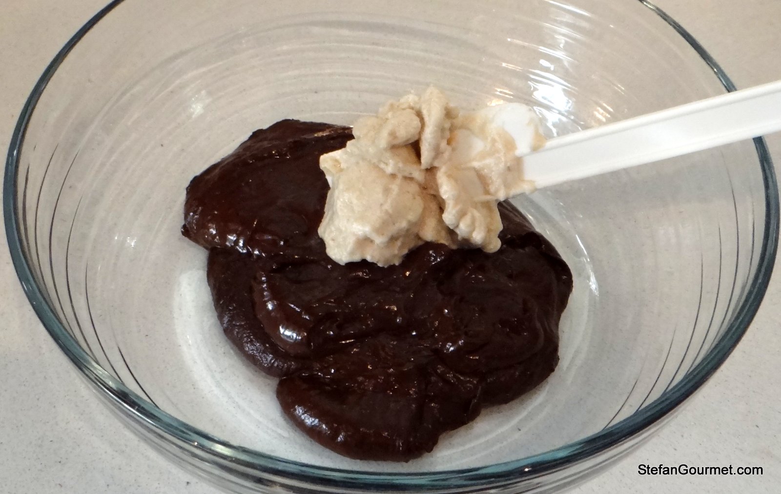 Gently fold the egg whites into the chocolate mixture in three additions using a rubber spatula, trying to keep in as much air as possible.