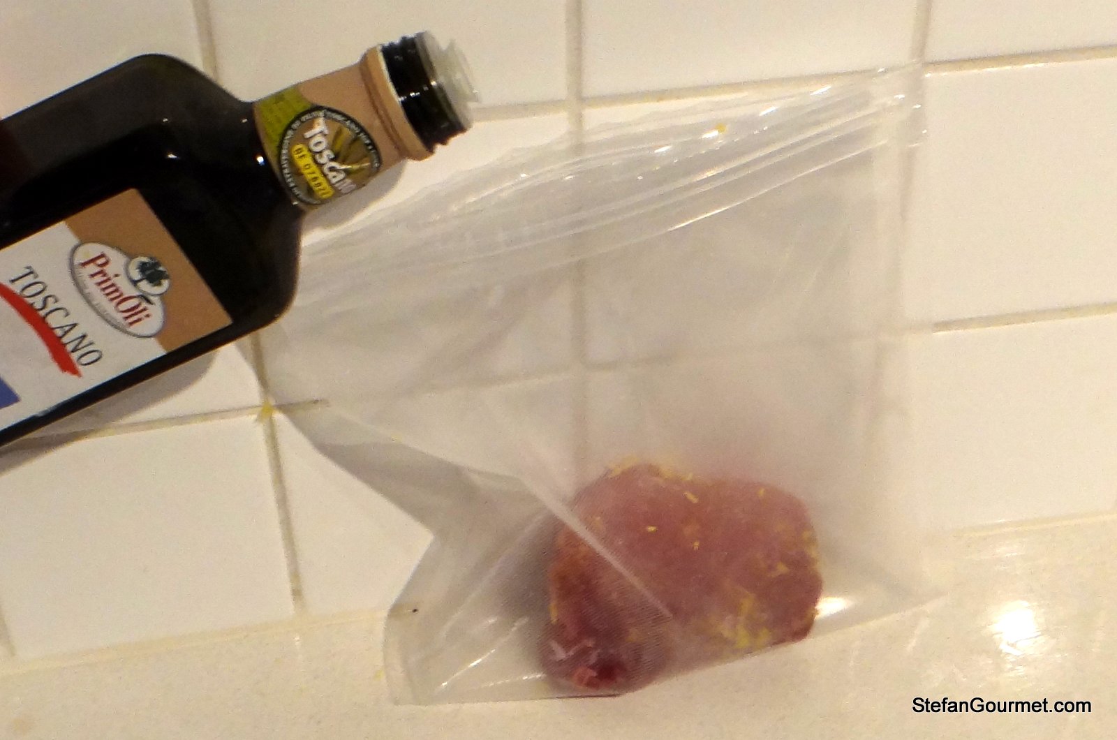 Combine the tuna with the salt, lemon zest, and olive oil in a sous-vide bag. This needs to be a ziploc bag unless you have a chamber vacuum sealer.