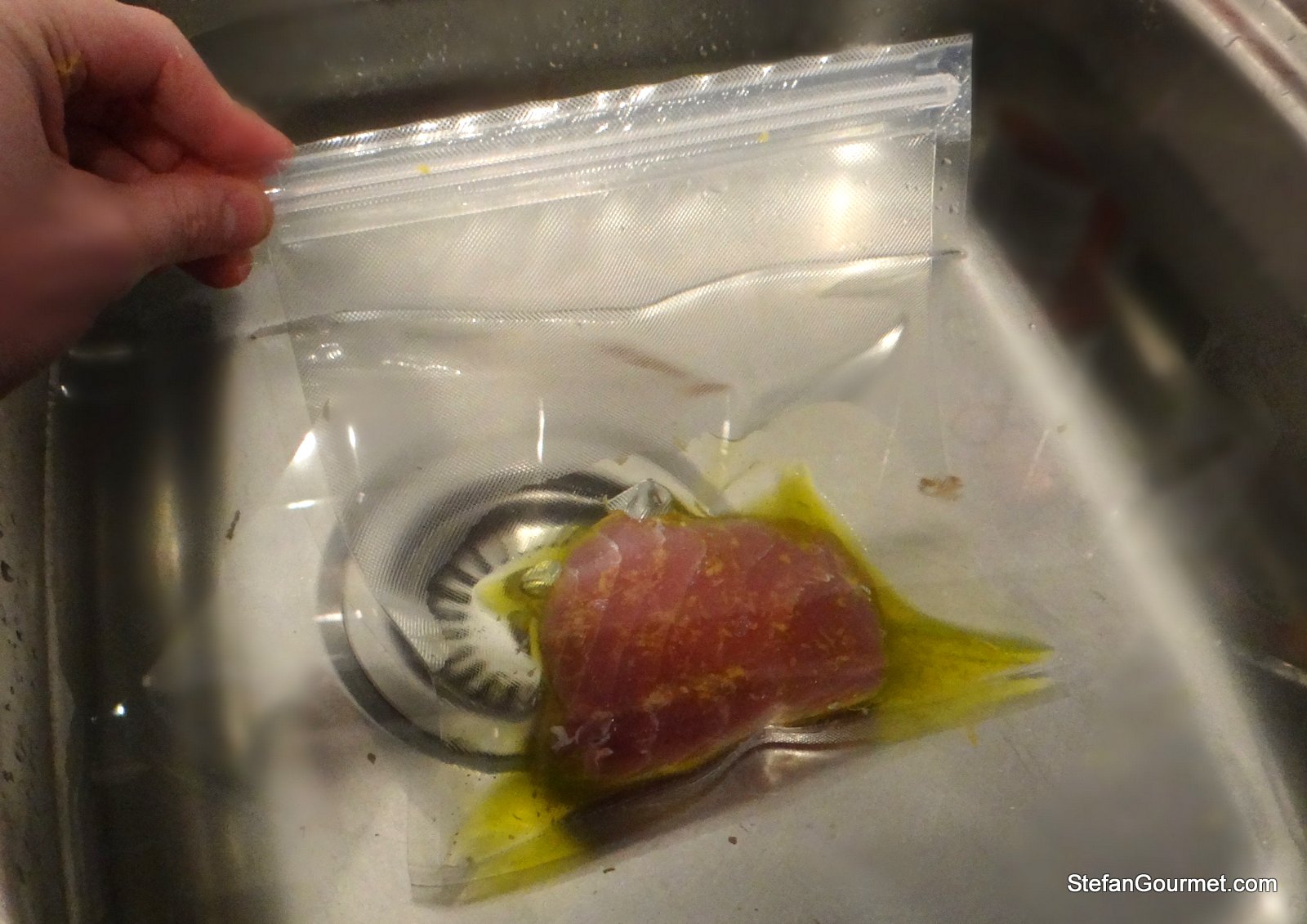 Vacuum seal the tuna with a chamber vacuum sealer, or close the ziploc bag with as little air as possible by submerging it in water.
